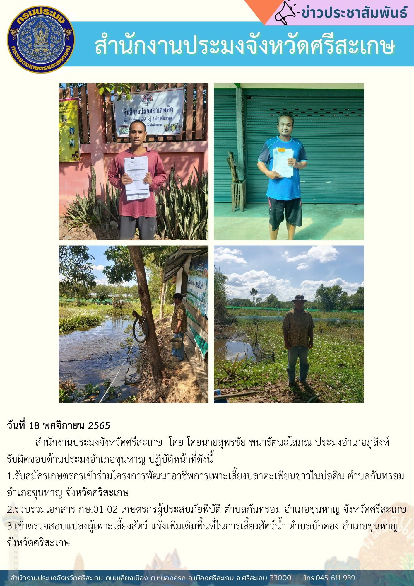 สำนักงานประมงจังหวัดศรีสะเกษ โดยนายสุพรชัย พนารัตนะโสภณ ประมงอำเภอภูสิงห์ รับผิดชอบด้านประมงอำเภอขุนหาญ ปฏิบัติหน้าที่ดังนี้