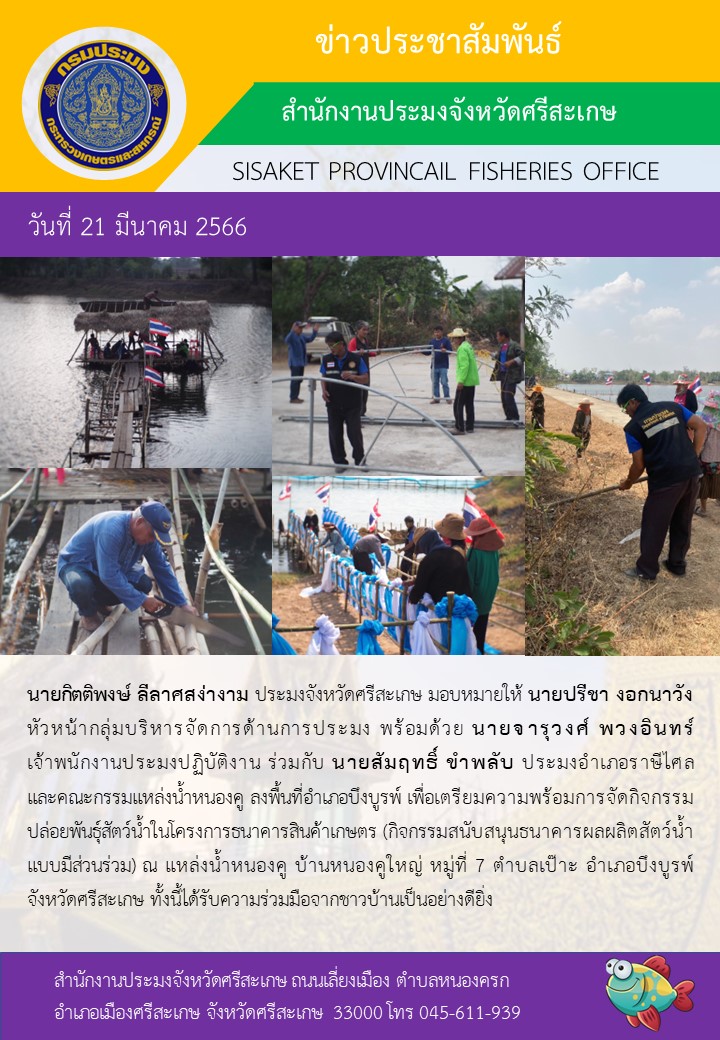 นายกิตติพงษ์ ลีลาศสง่างาม ประมงจังหวัดศรีสะเกษ มอบหมายให้ นายปรีชา งอกนาวัง หัวหน้ากลุ่มบริหารจัดการด้านการประมง พร้อมด้วย นายจารุวงศ์ พวงอินทร์ เจ้าพนักงานประมงปฏิบัติงาน ร่วมกับ นายสัมฤทธิ์ ขำพลับ ประมงอำเภอราษีไศล และคณะกรรมแหล่งน้ำหนองคู ลงพื้นที่อำเภอบึงบูรพ์ เพื่อเตรียมความพร้อมการจัดกิจกรรมปล่อยพันธุ์สัตว์น้ำในโครงการธนาคารสินค้าเกษตร (กิจกรรมสนับสนุนธนาคารผลผลิตสัตว์น้ำแบบมีส่วนร่วม) ณ แหล่งน้ำหนองคู บ้านหนองคูใหญ่ หมู่ที่ 7 ตำบลเป๊าะ อำเภอบึงบูรพ์ จังหวัดศรีสะเกษ ทั้งนี้ได้รับความร่วมมือจากชาวบ้านเป็นอย่างดียิ่ง