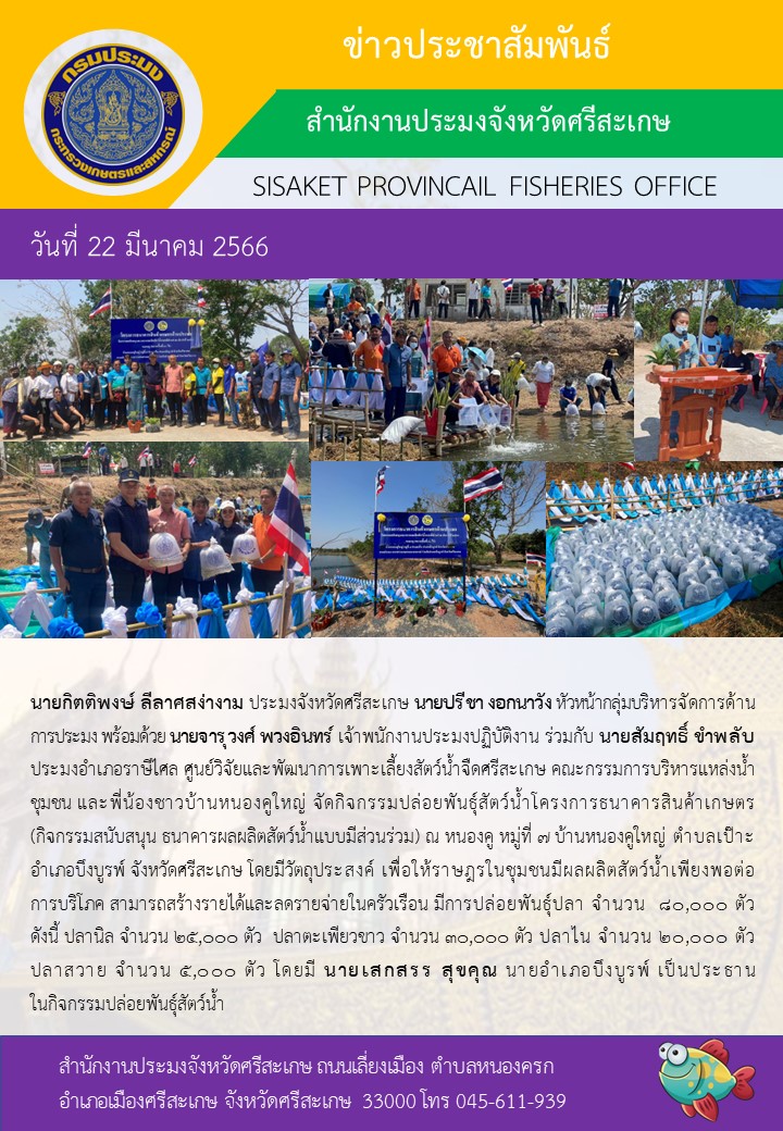 สำนักงานประมงจังหวัดศรีสะเกษ ร่วมกับศูนย์วิจัยและพัฒนาการเพาะเลี้ยงสัตว์น้ำจืดศรีสะเกษ คณะกรรมการบริหารแหล่งน้ำชุมชน และพี่น้องชาวบ้านหนองคูใหญ่ จัดกิจกรรมปล่อยพันธุ์สัตว์น้ำโครงการธนาคารสินค้าเกษตร (กิจกรรมสนับสนุน ธนาคารผลผลิตสัตว์น้ำแบบมีส่วนร่วม) ณ หนองคู หมู่ที่ ๗ บ้านหนองคูใหญ่ ตำบลเป๊าะ อำเภอบึงบูรพ์ จังหวัดศรีสะเกษ โดยมีวัตถุประสงค์