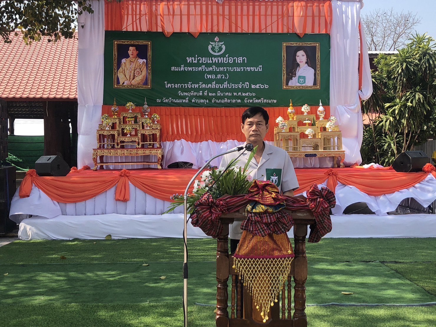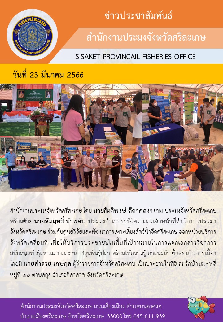 สำนักงานประมงจังหวัดศรีสะเกษ โดย นายกิตติพงษ์ ลีลาศสง่างาม ประมงจังหวัดศรีสะเกษ พร้อมด้วย นายสัมฤทธิ์ ขำพลับ ประมงอำเภอราษีไศล และเจ้าหน้าที่สำนักงานประมงจังหวัดศรีสะเกษ ร่วมกับศูนย์วิจัยและพัฒนาการเพาะเลี้ยงสัตว์น้ำจืดศรีสะเกษ ออกหน่วยบริการจังหวัดเคลื่อนที่ เพื่อให้บริการประชาชนในพื้นที่เป้าหมายในการแจกเอกสารวิชาการ สนับสนุนพันธุ์แหนแดง และสนับสนุนพันธุ์ปลา พร้อมให้ความรู้ คำแนะนำ ขั้นตอนในการเลี้ยง โดยมี นายสำรวย เกษกุล ผู้ว่าราชการจังหวัดศรีสะเกษ เป็นประธานในพิธี ณ วัดบ้านมะหลี่ หมู่ที่ ๑๒ ตำบลกุง อำเภอศิลาลาด จังหวัดศรีสะเกษ