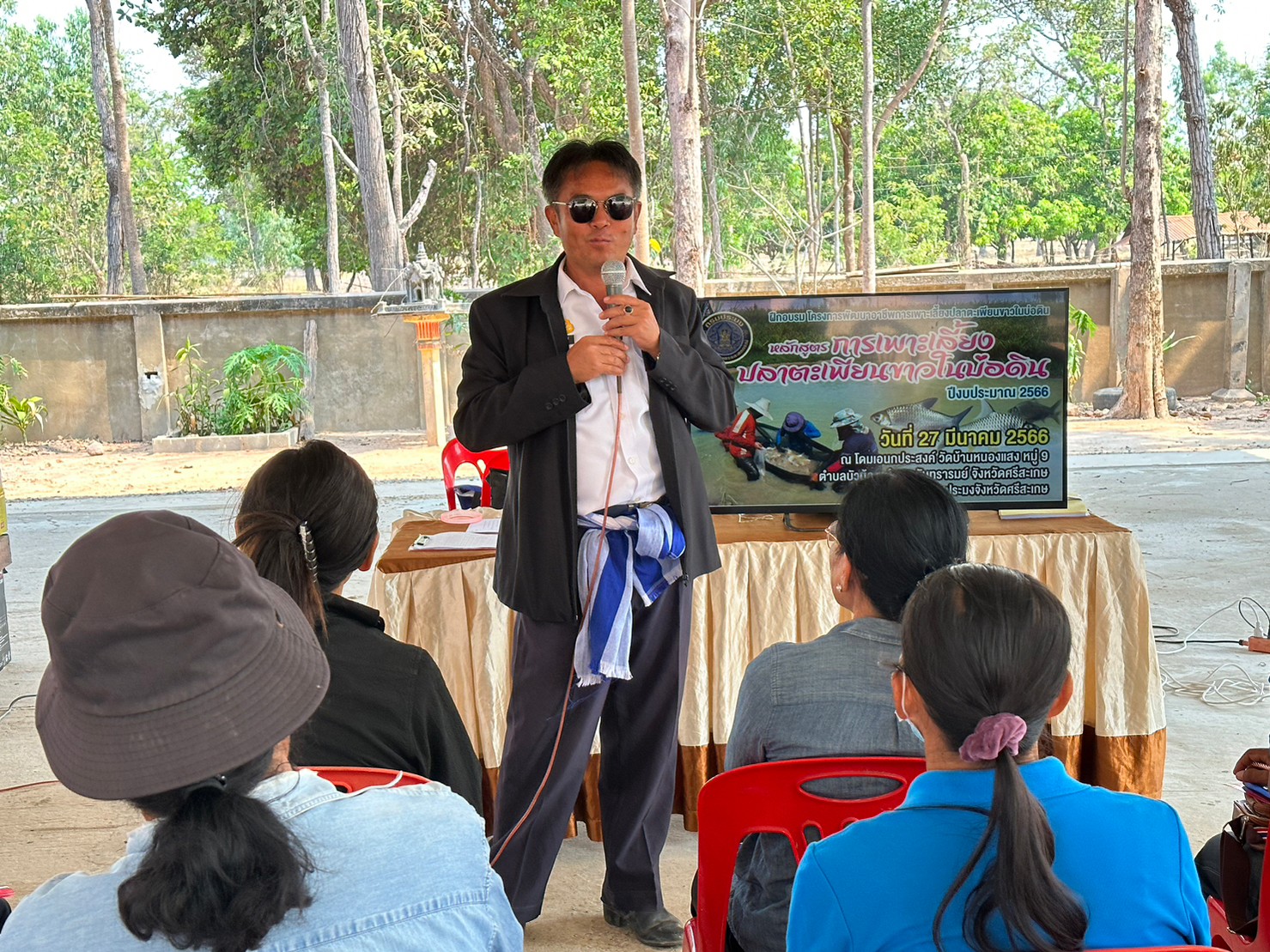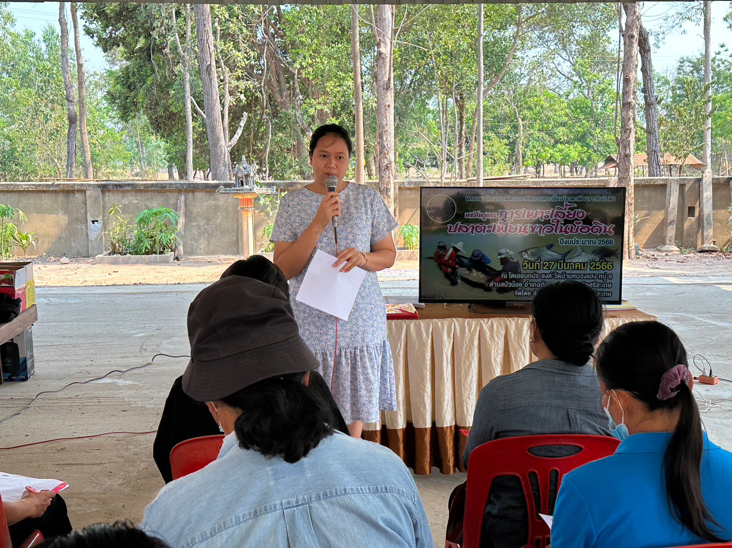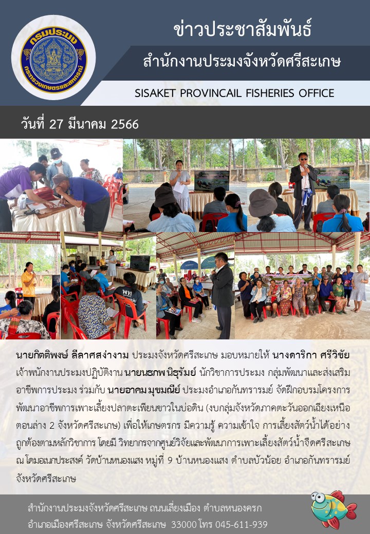 นายกิตติพงษ์ ลีลาศสง่างาม ประมงจังหวัดศรีสะเกษ มอบหมายให้ นางดาริกา ศรีวิชัย เจ้าพนักงานประมงปฏิบัติงาน นายนธภพ นิธุรัมย์ นักวิชาการประมง กลุ่มพัฒนาและส่งเสริมอาชีพการประมง ร่วมกับ นายอาคม มุขมณีย์ ประมงอำเภอกันทรารมย์ จัดฝึกอบรมโครงการพัฒนาอาชีพการเพาะเลี้ยงปลาตะเพียนขาวในบ่อดิน (งบกลุ่มจังหวัดภาคตะวันออกเฉียงเหนือตอนล่าง 2 จังหวัดศรีสะเกษ) เพื่อให้เกษตรกร มีความรู้ ความเข้าใจ การเลี้ยงสัตว์น้ำได้อย่างถูกต้องตามหลักวิชาการ โดยมี วิทยากรจากศูนย์วิจัยและพัฒนาการเพาะเลี้ยงสัตว์น้ำจืดศรีสะเกษ ณ โดมอเนกประสงค์ วัดบ้านหนองแสง หมู่ที่ 9 บ้านหนองแสง ตำบลบัวน้อย อำเภอกันทรารมย์ จังหวัดศรีสะเกษ