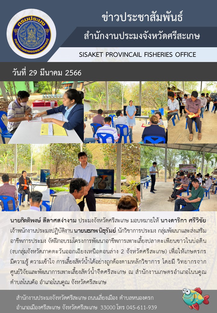 นายกิตติพงษ์ ลีลาศสง่างาม ประมงจังหวัดศรีสะเกษ มอบหมายให้ นางดาริกา ศรีวิชัย เจ้าพนักงานประมงปฏิบัติงาน นายนธภพ นิธุรัมย์ นักวิชาการประมง กลุ่มพัฒนาและส่งเสริมอาชีพการประมง จัดฝึกอบรมโครงการพัฒนาอาชีพการเพาะเลี้ยงปลาตะเพียนขาวในบ่อดิน (งบกลุ่มจังหวัดภาคตะวันออกเฉียงเหนือตอนล่าง 2 จังหวัดศรีสะเกษ) เพื่อให้เกษตรกร มีความรู้ ความเข้าใจ การเลี้ยงสัตว์น้ำได้อย่างถูกต้องตามหลักวิชาการ โดยมี วิทยากรจากศูนย์วิจัยและพัฒนาการเพาะเลี้ยงสัตว์น้ำจืดศรีสะเกษ ณ สำนักงานเกษตรอำเภอโนนคูณ ตำบลโนนค้อ อำเภอโนนคูณ จังหวัดศรีสะเกษ