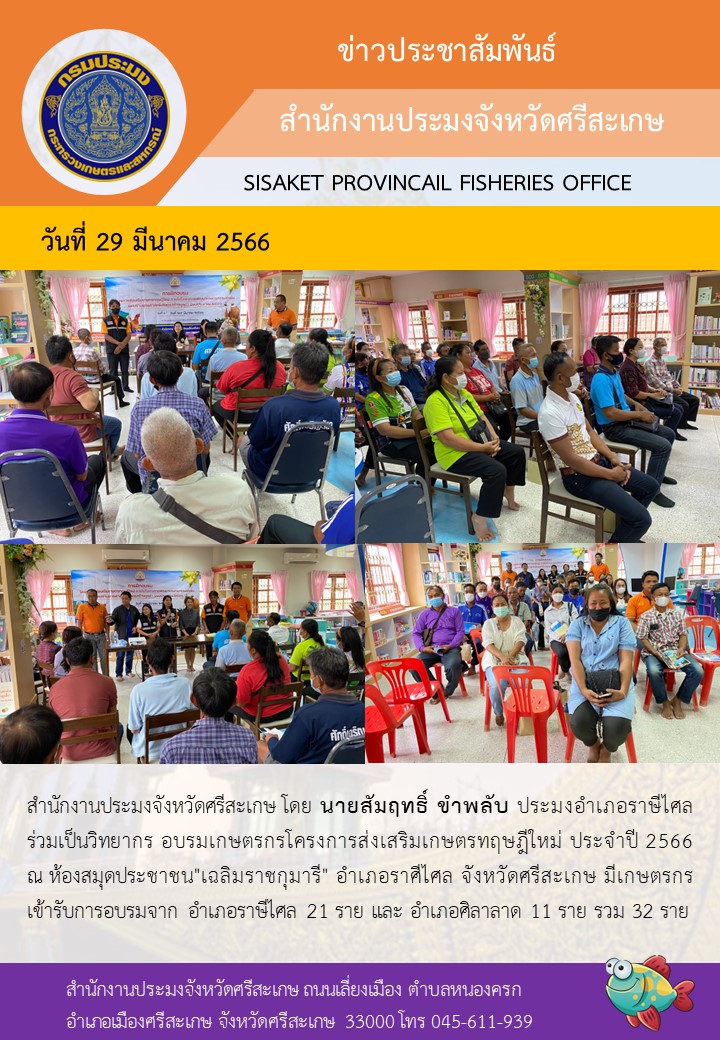 สำนักงานประมงจังหวัดศรีสะเกษ โดย นายสัมฤทธิ์ ขำพลับ ประมงอำเภอราษีไศล ร่วมเป็นวิทยากร อบรมเกษตรกรโครงการส่งเสริมเกษตรทฤษฎีใหม่ ประจำปี 2566 ณ ห้องสมุดประชาชน"เฉลิมราชกุมารี" อำเภอราษีไศล จังหวัดศรีสะเกษ มีเกษตรกรเข้ารับการอบรมจาก อำเภอราษีไศล 21 ราย และ อำเภอศิลาลาด 11 ราย รวม 32 ราย