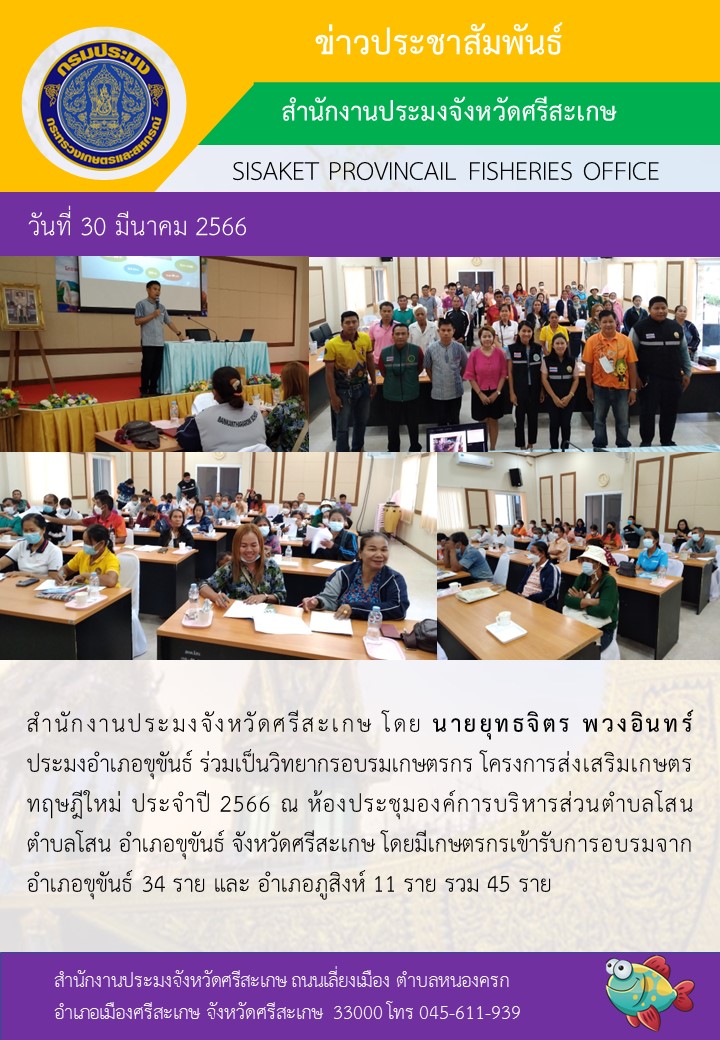 สำนักงานประมงจังหวัดศรีสะเกษ โดย นายยุทธจิตร พวงอินทร์ ประมงอำเภอขุขันธ์ ร่วมเป็นวิทยากรอบรมเกษตรกร โครงการส่งเสริมเกษตรทฤษฎีใหม่ ประจำปี 2566 ณ ห้องประชุมองค์การบริหารส่วนตำบลโสน ตำบลโสน อำเภอขุขันธ์ จังหวัดศรีสะเกษ โดยมีเกษตรกรเข้ารับการอบรมจาก อำเภอขุขันธ์ 34 ราย และ อำเภอภูสิงห์ 11 ราย รวม 45 ราย
