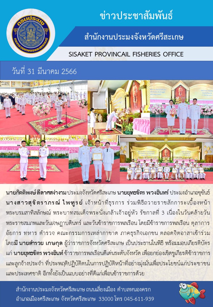นายกิตติพงษ์ ลีลาศสง่างาม ประมงจังหวัดศรีสะเกษ นายยุทธจิตร พวงอินทร์ ประมงอำเภอขุขันธ์ นางสาวสุจิตราภรณ์ ไพฑูรย์ เจ้าหน้าที่ธุรการ ร่วมพิธีถวายราชสักการะเบื้องหน้าพระบรมสาทิสลักษณ์ พระบาทสมเด็จพระนั่งเกล้าเจ้าอยู่หัว รัชกาลที่ 3 เนื่องในวันคล้ายวันพระราชสมภพและวันเจษฎาบดินทร์ และวันข้าราชการพลเรือน โดยมีข้าราชการพลเรือน ตุลาการ อัยการ ทหาร ตำรวจ คณะกรรมการเหล่ากาชาด ภาคธุรกิจเอกชน ตลอดจิตอาสาเข้าร่วม โดยมีนายสำรวย เกษกุล ผู้ว่าราชการจังหวัดศรีสะเกษ เป็นประธานในพิธี พร้อมมอบเกียรติบัตรแก่นายยุทธจิตร พวงอินท์ ข้าราชการพลเรือนดีเด่นระดับจังหวัด เพื่อยกย่องเชิดชูเกียรติข้าราชการและลูกจ้างประจำ ที่ประพฤติปฏิบัติตนในการปฏิบัติหน้าที่อย่างมุ่งมั่นเพื่อประโยชน์แก่ประชาชนและประเทศชาติ อีกทั้งยังเป็นแบบอย่างที่ดีแก่เพื่อนข้าราชการด้วย