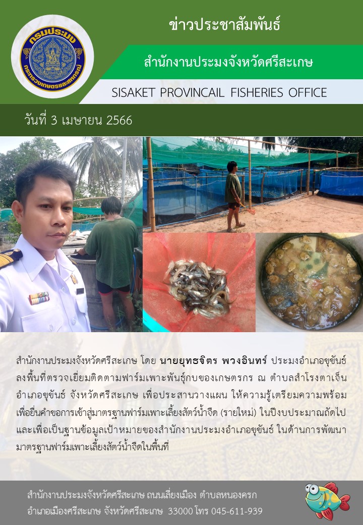 สำนักงานประมงจังหวัดศรีสะเกษ โดย นายยุทธจิตร พวงอินทร์ ประมงอำเภอขุขันธ์ ลงพื้นที่ตรวจเยี่ยมติดตามฟาร์มเพาะพันธุ์กบของเกษตรกร ณ ตำบลสำโรงตาเจ็น อำเภอขุขันธ์ จังหวัดศรีสะเกษ เพื่อประสานวางแผน ให้ความรู้เตรียมความพร้อม เพื่อยื่นคำขอการเข้าสู่มาตรฐานฟาร์มเพาะเลี้ยงสัตว์น้ำจืด (รายใหม่) ในปีงบประมาณถัดไป และเพื่อเป็นฐานข้อมูลเป้าหมายของสำนักงานประมงอำเภอขุขันธ์ ในด้านการพัฒนามาตรฐานฟาร์มเพาะเลี้ยงสัตว์น้ำจืดในพื้นที่