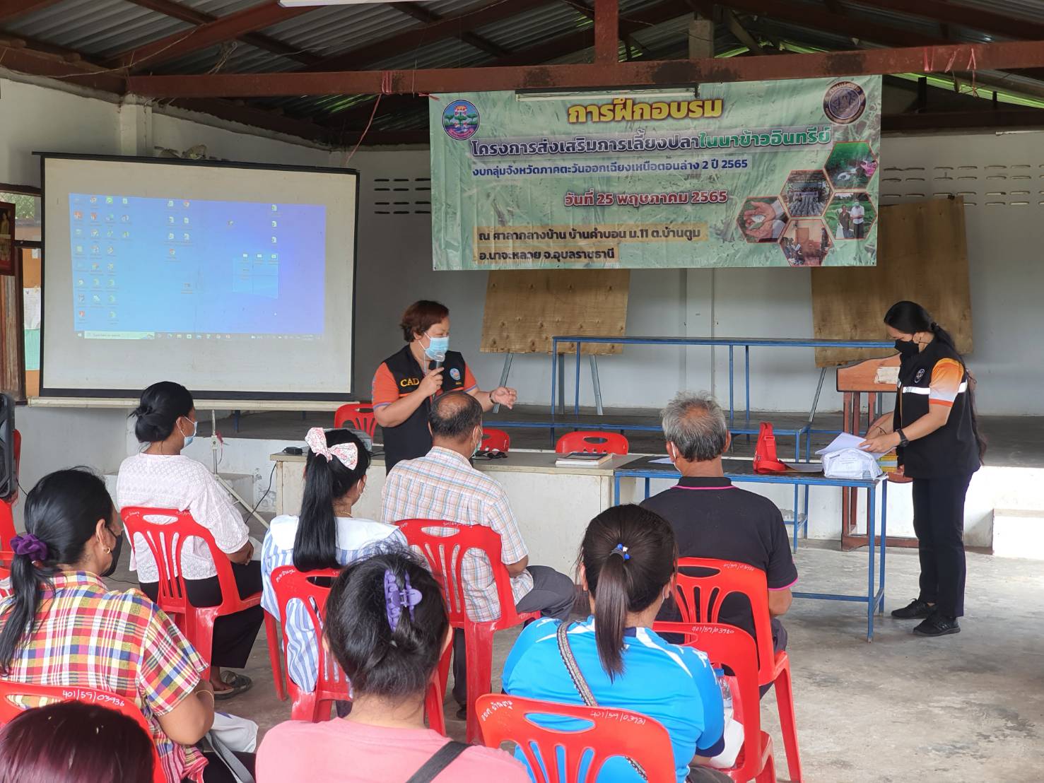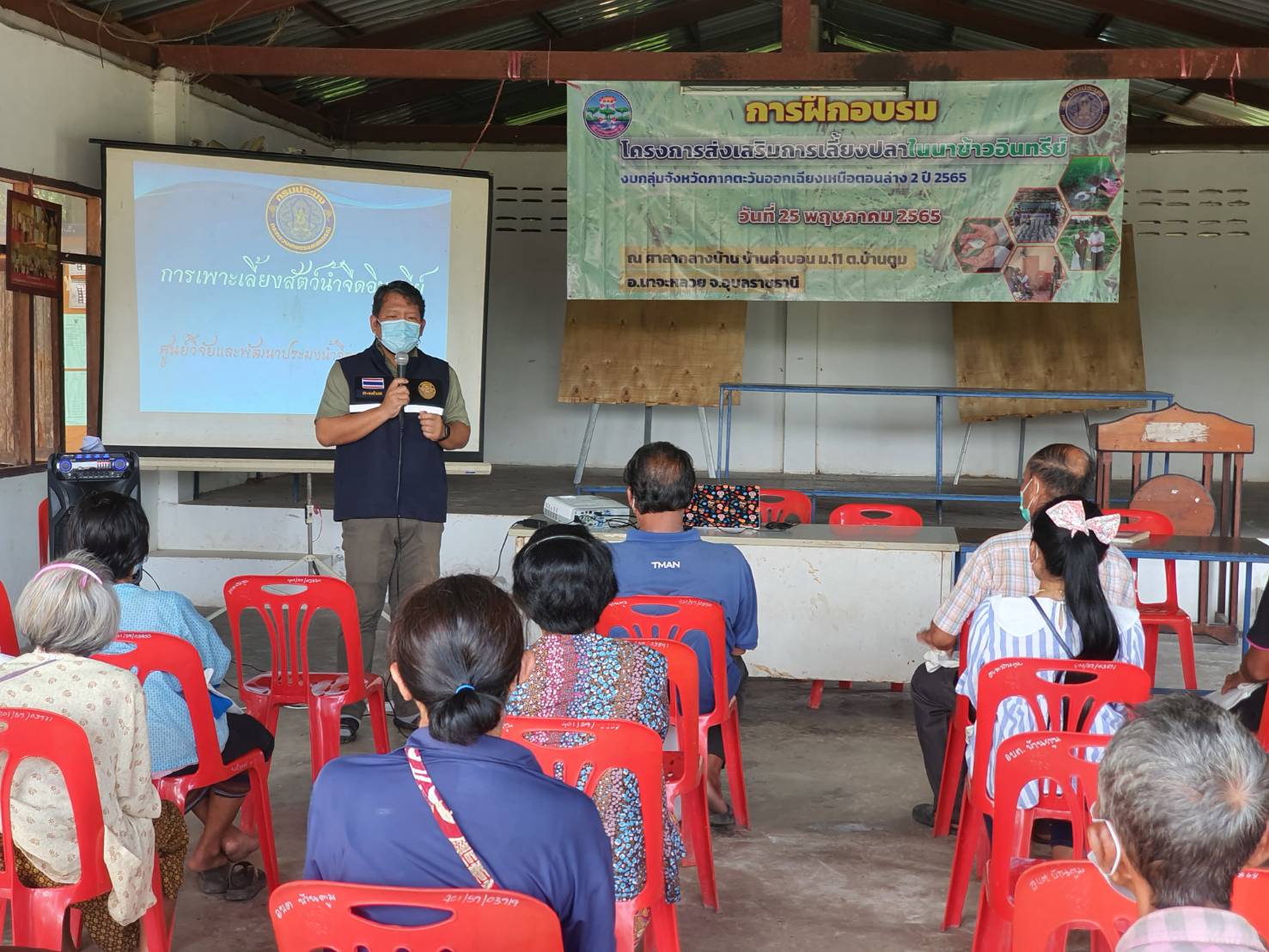 วันนี้ (25 พฤษภาคม 2565) เวลา 08.00 น. นายประชุม ดวนใหญ่ หัวหน้ากลุ่มพัฒนาและส่งเสริมอาชีพการประมง มอบหมายให้ นายบัญชา ไกยสิทธิ์ นักวิชาการประมง พร้อมด้วยนายศุภวัฒน์ เที่ยงผดุง ประมงอำเภอนาจะหลวย จัดอบรมโครงการส่งเสริมการเลี้ยงปลาในนาข้าวอินทรีย์ งบกลุ่มจังหวัดภาคตะวันออกเฉียงเหนือตอนล่าง 2 ปี 2565 ณ ศาลากลางบ้าน บ้านคำบอน หมู่ 11 อำเภอนาจะหลวย จังหวัดอุบลราชธานี โดยมีวิทยากรจากศูนย์วิจัยและพัฒนาประมงน้ำจืดอุบลราชธานี ถ่ายทอดความรู้เรื่องหลักการเลี้ยงปลาในนาข้าวอินทรีย์ และวิทยากรจากสำนักงานตรวจบัญชีสหกรณ์อุบลราชธานีถ่ายทอดความรู้เรื่องการจัดทำบัญชีรับจ่ายในครัวเรือน และต้นทุนการประกอบอาชีพ ให้แก่เกษตรกรที่เข้าร่วมโครงการฯจำนวน 20 ราย