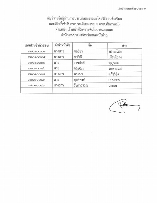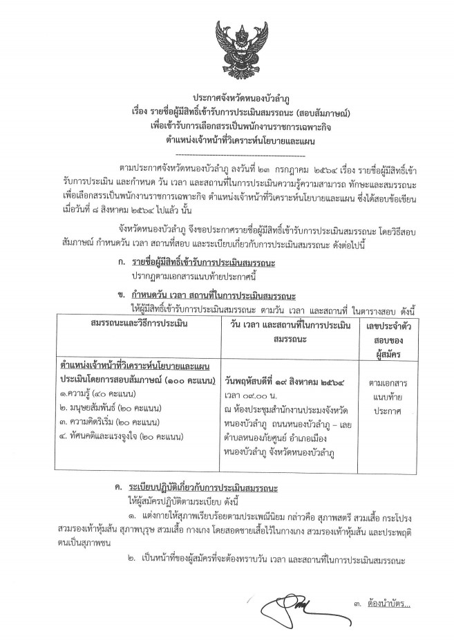 ประกาศจังหวัดหนองบัวลำภู เรื่อง รายชื่อผู้มีสิทธิ์เข้ารับการประเมินสมรรถนะ (สอบสัมภาษณ์) ตำแหน่ง เจ้าหน้าที่วิเคราะห์นโยบายและแผน