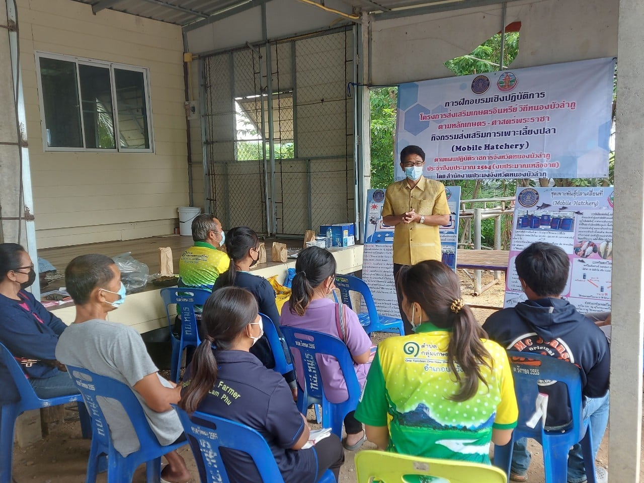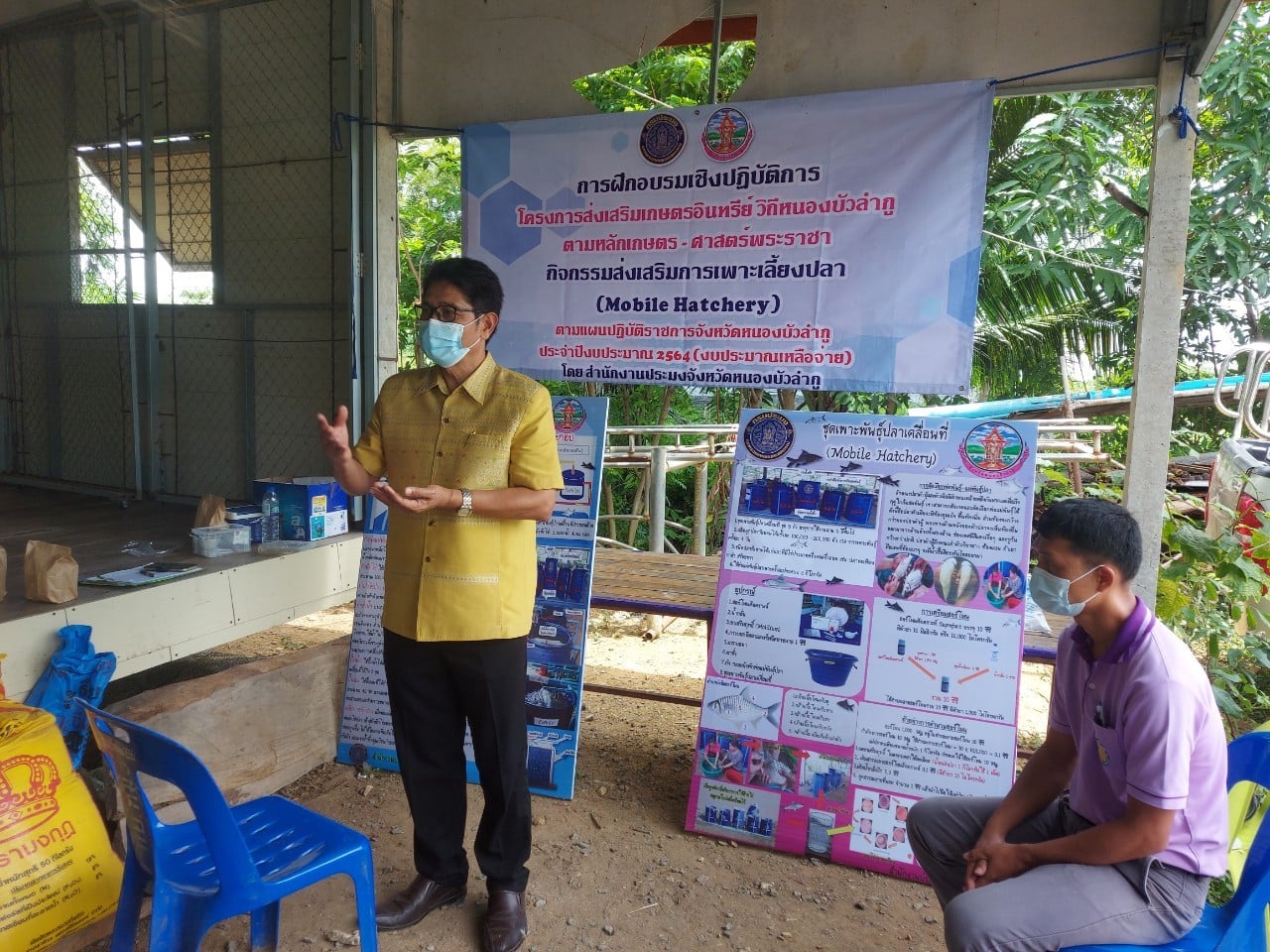 วันที่ 27 - 28 สิงหาคม 2564 กลุ่มพัฒนาและส่งเสริมอาชีพการประมง จัดฝึกอบรมเชิงปฏิบัติการโครงการส่งเสริมเกษตรอินทรีย์ วิถีหนองบัวลำภู ตามหลักเกษตร - ศาสตร์พระราชา กิจกรรมส่งเสริมการเพาะเลี้ยงปลา (Mobile Hatchery) ตามแผนปฏิบัติราชการจังหวัดหนองบัวลำภู ประจำปีงบประมาณ 2564 (งบจังหวัดปี 2564) ให้แก่กลุ่มเกษตรกรที่เข้าร่วมโครงการฯ ในพื้นที่อำเภอนาวัง จำนวน 5 กลุ่ม ซึ่งมีเกษตรกรกลุ่มละ 10 ราย ทั้งนี้ได้มีการปฏิบัติตามมาตรการป้องกันการแพร่ระบาดของโรคไวรัสโควิด-19 ของทางจังหวัดหนองบัวลำภู อย่างเคร่งครัด