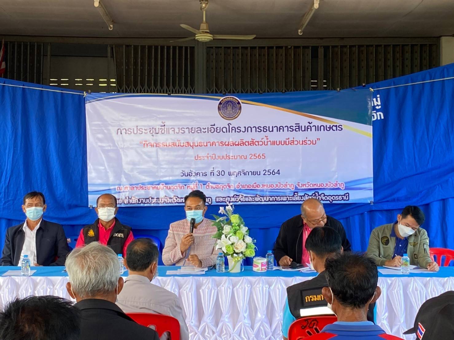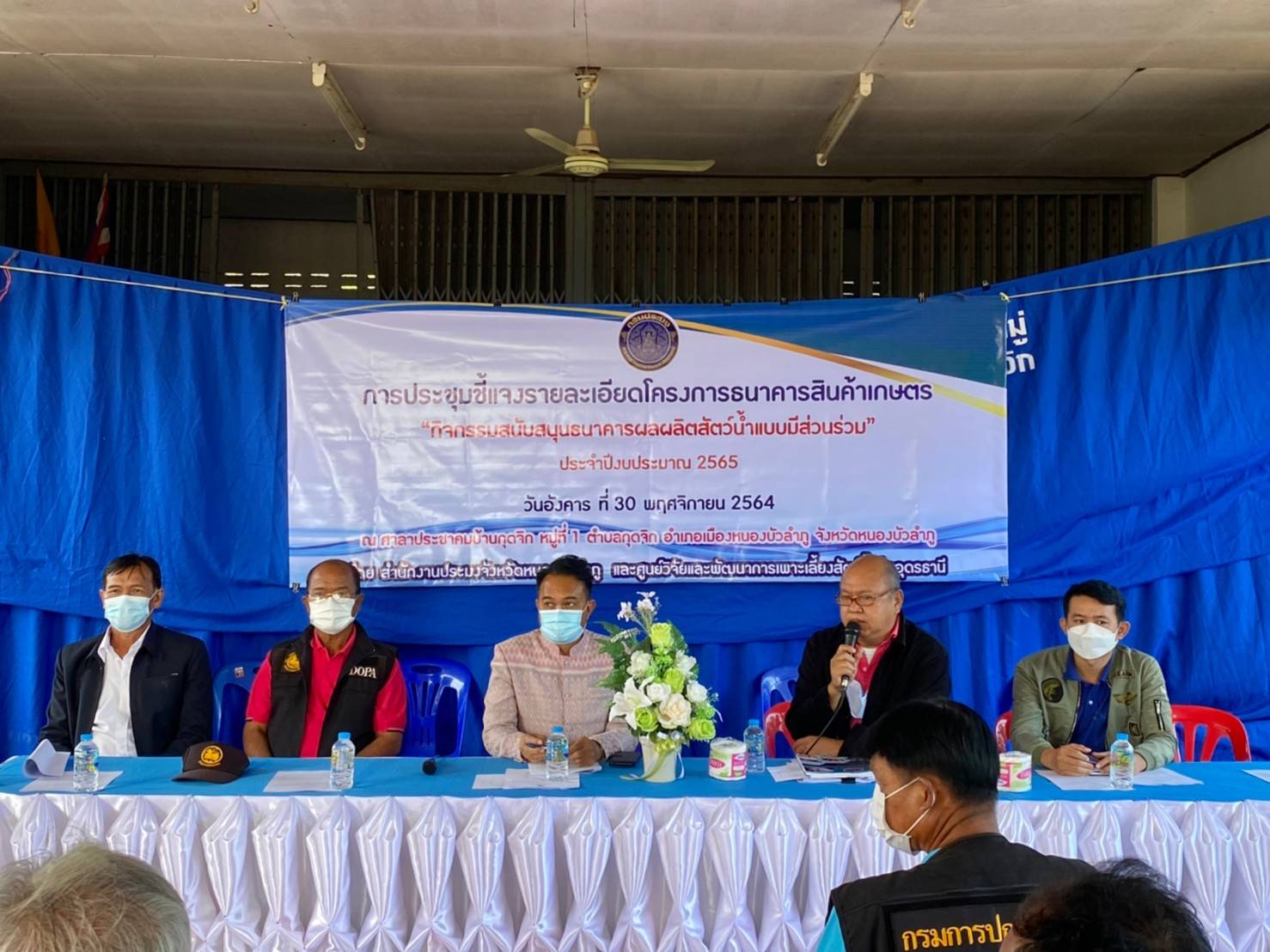วันที่ 30 พฤศจิกายน และวันที่ 1 ธันวาคม 2564 นายบุญหลาย กุลนารัตน์ ประมงจังหวัดหนองบัวลำภู มอบหมายให้ นายสมจิตร์ พงษ์ภุมมา หัวหน้ากลุ่มบริหารจัดการด้านการประมง พร้อมด้วยเจ้าหน้าที่จากสำนักงานประมงจังหวัดหนองบัวลำภู ร่วมกับศูนย์วิจัยและพัฒนาการเพาะเลี้ยงสัตว์น้ำจืดอุดรธานี องค์การบริหารส่วนตำบลกุดจิก ผู้นำชุมชน กำนัน ผู้ใหญ่บ้าน และประชาชนในพื้นที่เป้าหมาย จัดประชุมชี้แจงรายละเอียดโครงการธนาคารสินค้าเกษตร (กิจกรรมสนับสนุนธนาคารผลผลิตสัตว์น้ำแบบมีส่วนร่วม) ประจำปีงบประมาณ 2565 ณ ศาลาประชาคมบ้านกุดจิก หมู่ที่ 1 ตำบลกุดจิก อำเภอเมืองหนองบัวลำภู จังหวัดหนองบัวลำภู โดยมีนายประยูร อรัญรุท นายอำเภอเมืองหนองบัวลำภู เป็นประธานเปิดการประชุม มีผู้เข้าร่วมประชุมทั้งสิ้น 86 ราย ทั้งนี้ในที่ประชุมได้ดำเนินการแต่งตั้งคณะกรรมการแหล่งน้ำ เพื่อดำเนินงานโครงการและกำหนดบทบาทหน้าที่ของคณะกรรมการ พร้อมกำหนดกฎกติกาของชุมชนและจัดทำแผนการใช้จ่ายเงินงบอุดหนุน ในการดำเนินกิจกรรมเพื่อเพิ่มผลผลิตสัตว์น้ำและขับเคลื่อนการบริหารงานของธนาคารประจำแหล่งน้ำ