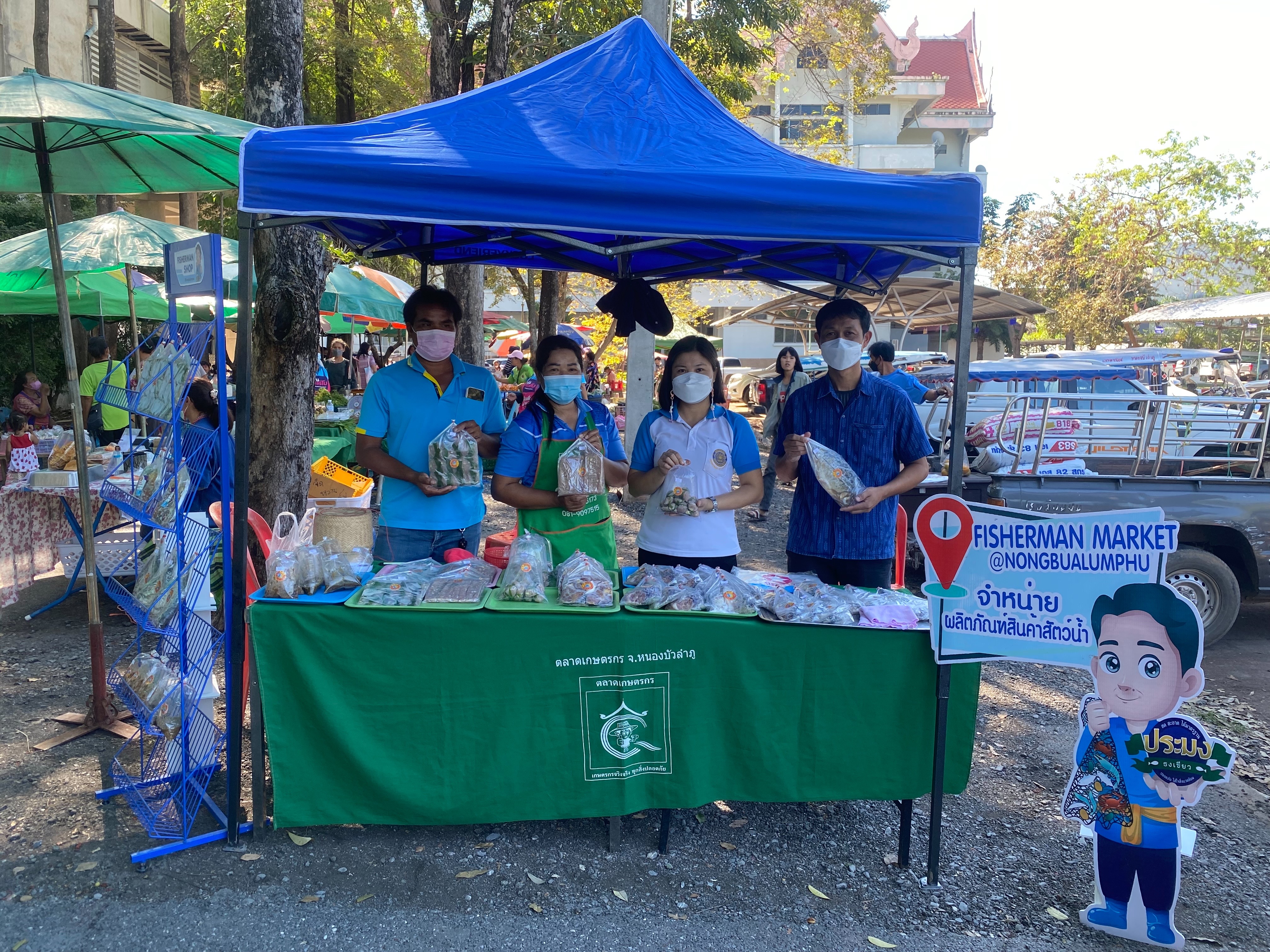 นางสาวทัศนีย์ สุนนท์ชัย หัวหน้ากลุ่มพัฒนาและส่งเสริมอาชีพการประมง รักษาราชการแทนประมงจังหวัดหนองบัวลำภู มอบหมายให้เจ้าหน้าที่กลุ่มพัฒนาและส่งเสริมอาชีพการประมง ตรวจเยี่ยมและติดตามการจำหน่ายผลิตภัณฑ์แปรรูปสัตว์น้ำ ของกลุ่มวิสาหกิจชุมชนแปรรูปปลาห้วยบง 3 ตรา 3 A ภายใต้กิจกรรม FISHERMAN MARKET @ NONGBUALAMPHU ซึ่งจัดกิจกรรมจำหน่ายผลิตภัณฑ์ ทุกวันศุกร์ของสัปดาห์ ณ ตลาดประชารัฐบริเวณด้านข้างหอประชุมอนาลโย ศาลากลางจังหวัดหนองบัวลำภู