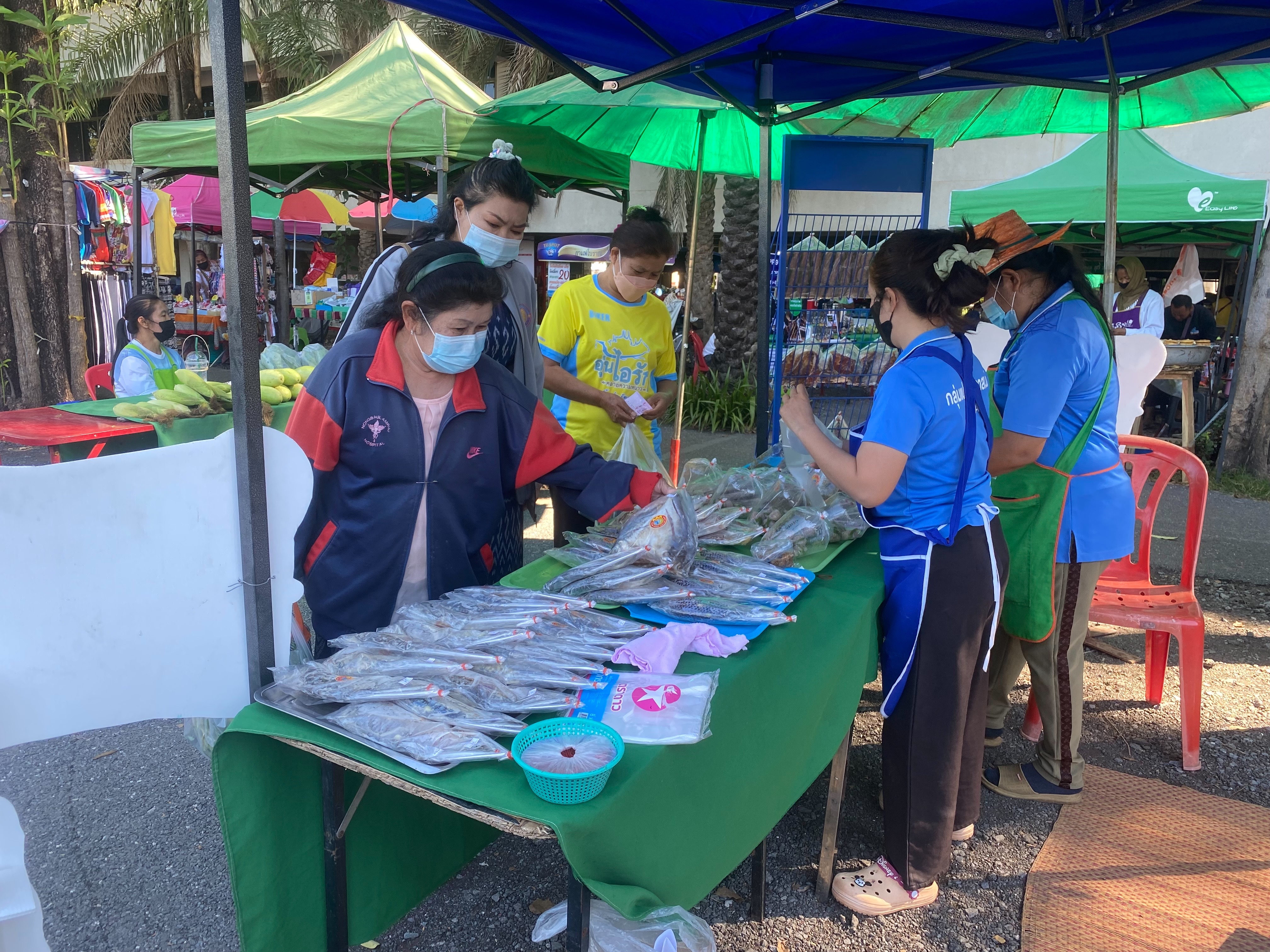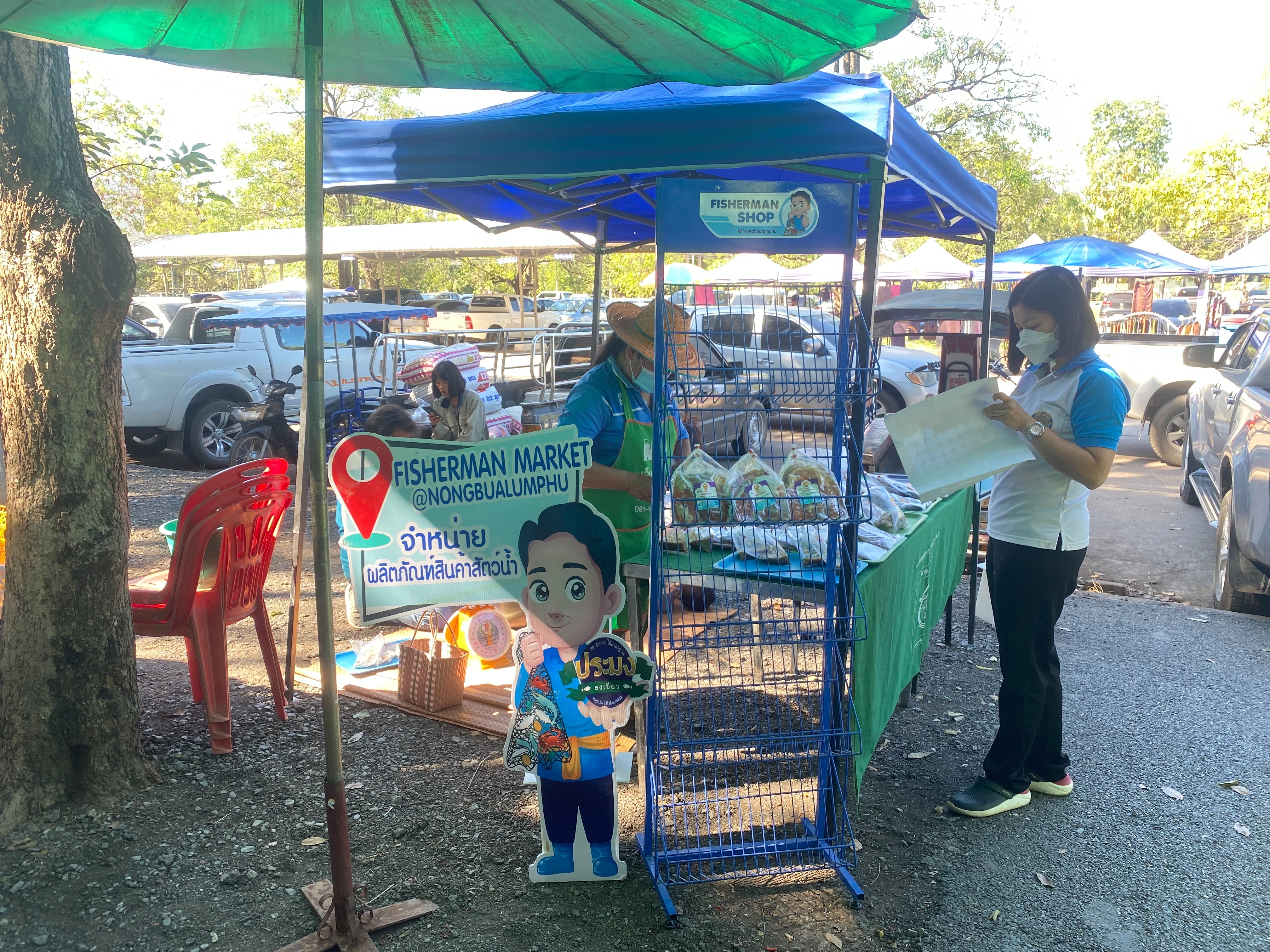 วันที่ 9 ธันวาคม 2565 ตรวจเยี่ยมและติดตามการจำหน่ายผลิตภัณฑ์แปรรูปสัตว์น้ำ ของกลุ่มวิสาหกิจชุมชนแปรรูปปลาห้วยบง 3 ตรา 3 A ภายใต้กิจกรรม FISHERMAN MARKET @ NONGBUALAMPHU