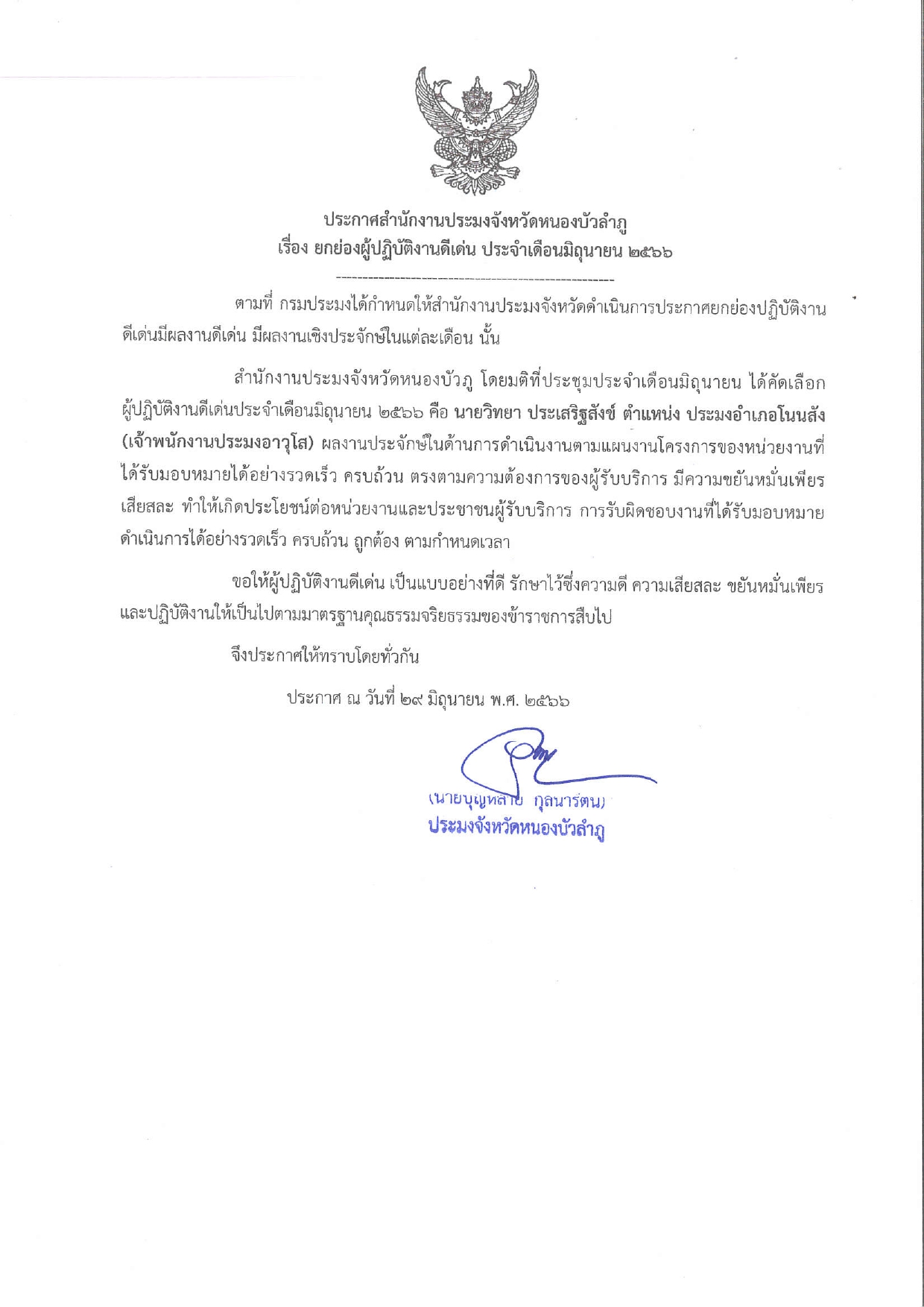 ประกาศยกย่องผู้ปฏิบัติงานดีเด่น ผลงานเป็นประจักษ์ ประจำเดือนมิถุนายน 2566