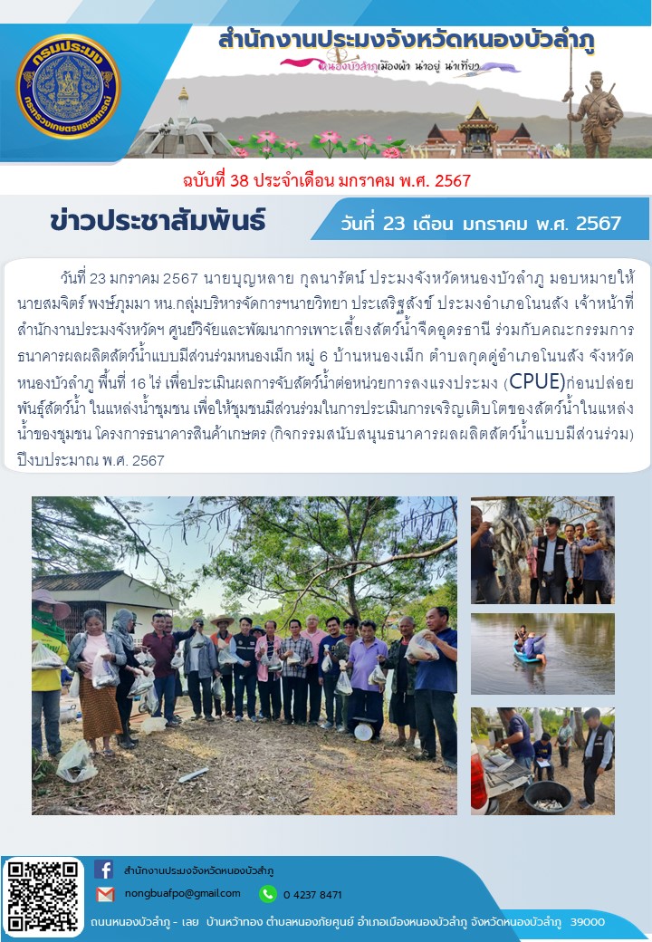 นายบุญหลาย กุลนารัตน์ ประมงจังหวัดหนองบัวลำภู มอบหมายให้นายสมจิตร์ พงษ์ภุมมา หน.กลุ่มบริหารจัดการฯนายวิทยา ประเสริฐสังข์ ประมงอำเภอโนนสัง เจ้าหน้าที่สำนักงานประมงจังหวัดฯ ศูนย์วิจัยและพัฒนาการเพาะเลี้ยงสัตว์น้ำจืดอุดรธานี ร่วมกับคณะกรรมการธนาคารผลผลิตสัตว์น้ำแบบมีส่วนร่วมหนองเม็ก หมู่ 6 บ้านหนองเม็ก ตำบลกุดดู่อำเภอโนนสัง จังหวัดหนองบัวลำภู พื้นที่ 16 ไร่ เพื่อประเมินผลการจับสัตว์น้ำต่อหน่วยการลงแรงประมง (CPUE) ก่อนปล่อยพันธุ์สัตว์น้ำ ในแหล่งน้ำชุมชน..คลิก