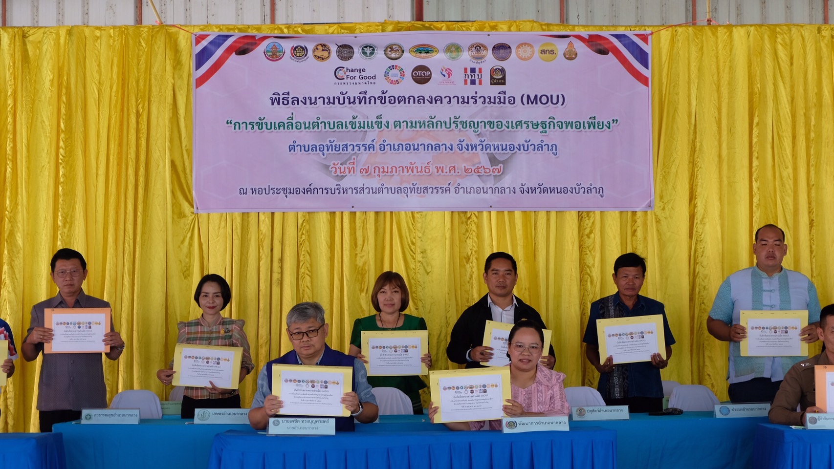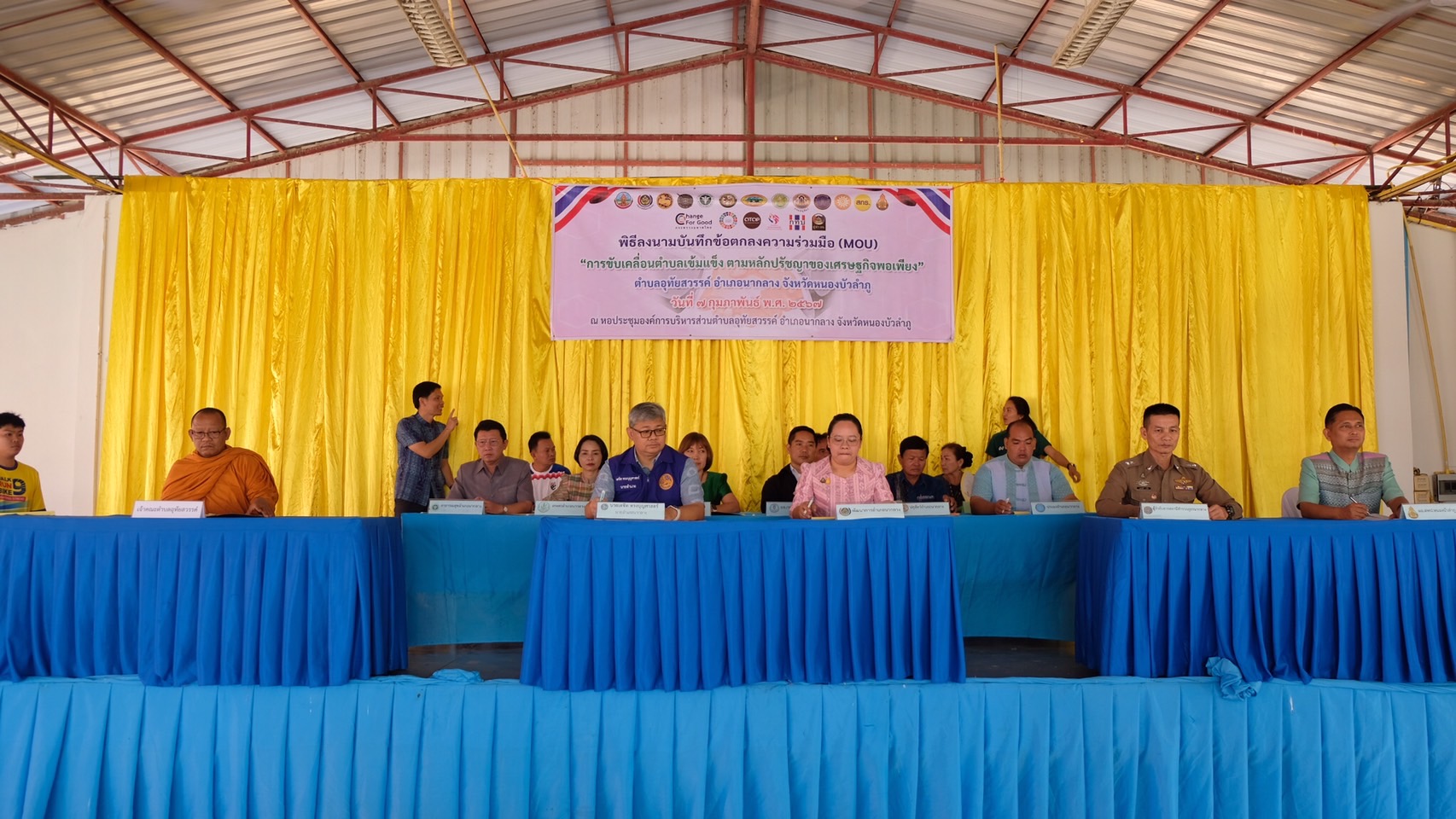 นายเมธา ตาลเหล็ก ประมงอำเภอนากลาง ร่วมลงนามบันทึกข้อตกลงความร่วมมือ (MOU) การขับเคลื่อนตำบลเข้มแข็งตามหลักปรัชญาของเศรษฐกิจพอเพียง ระดับอำเภอ