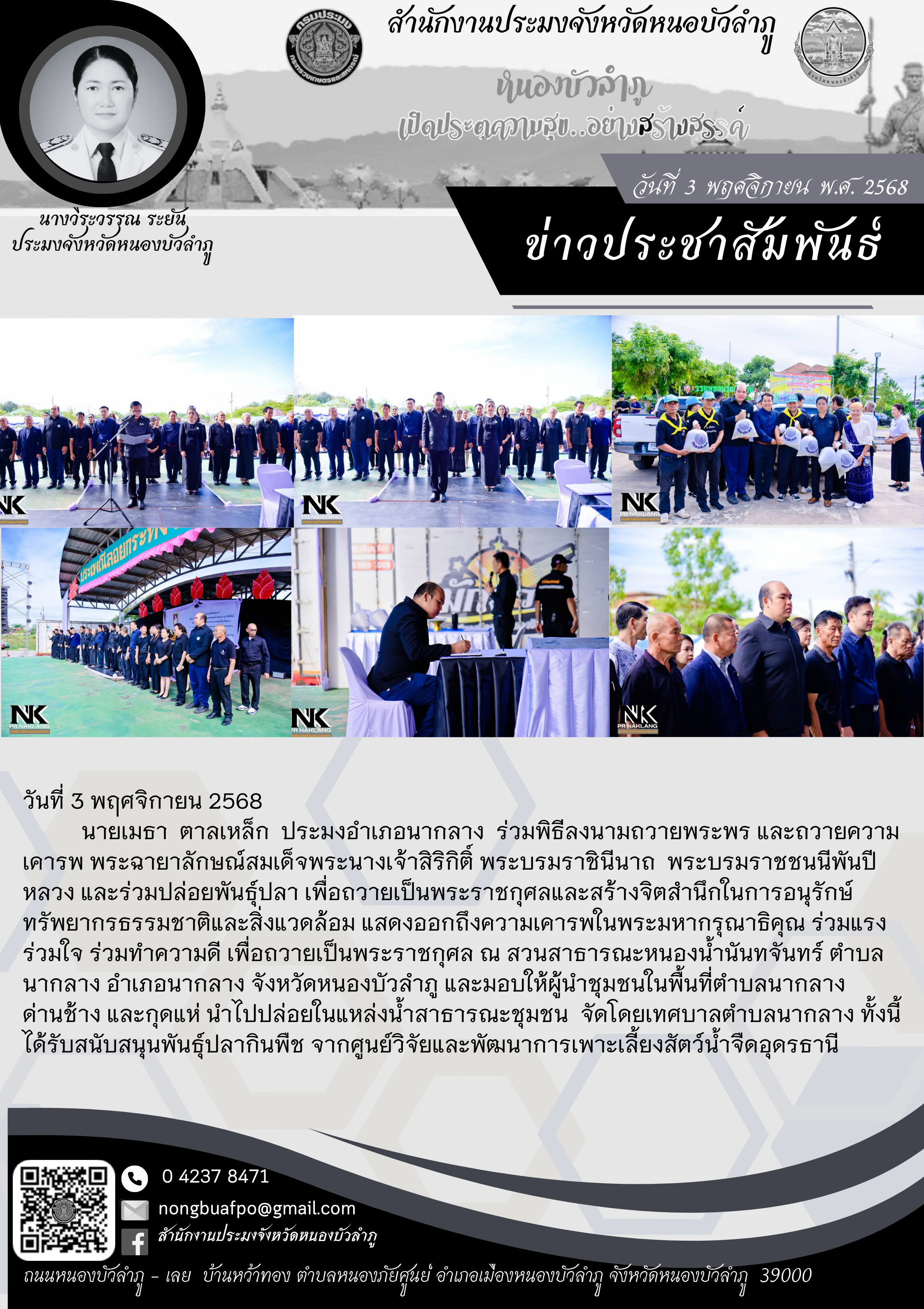 นายเมธา ตาลเหล็ก ประมงอำเภอนากลาง ร่วมพิธีลงนามถวายพระพร และถวายความเคารพ พระฉายาลักษณ์สมเด็จพระนางเจ้าสิริกิติ์ พระบรมราชินีนาถ พระบรมราชชนนีพันปีหลวง และร่วมปล่อยพันธุ์ปลา เพื่อถวายเป็นพระราชกุศลและสร้างจิตสำนึกในการอนุรักษ์ทรัพยากรธรรมชาติและสิ่งแวดล้อม แสดงออกถึงความเคารพในพระมหากรุณาธิคุณ ร่วมแรงร่วมใจ ร่วมทำความดี เพื่อถวายเป็นพระราชกุศล ณ สวนสาธารณะหนองน้ำนันทจันทร์ ตำบลนากลาง อำเภอนากลาง จังหวัดหนองบัวลำภู และมอบให้ผู้นำชุมชนในพื้นที่ตำบลนากลาง ด่านช้าง และกุดแห่ นำไปปล่อยในแหล่งน้ำสาธารณะชุมชน จัดโดยเทศบาลตำบลนากลาง ทั้งนี้ได้รับสนับสนุนพันธุ์ปลากินพืช จากศูนย์วิจัยและพัฒนาการเพาะเลี้ยงสัตว์น้ำจืดอุดรธานี