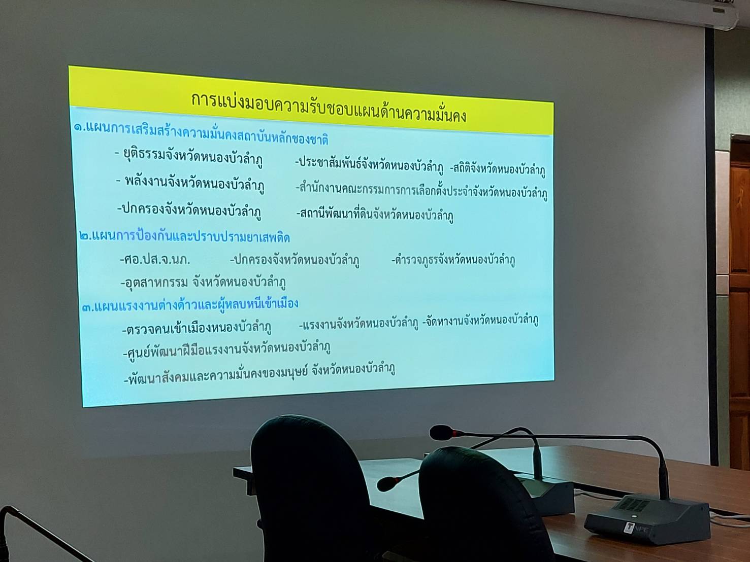 วันที่ 13 กรกฎาคม 2563 นายบุญหลาย กุลนารัตน์ ประมงจังหวัดหนองบัวลำภู มอบหมายให้นางถนอมขวัญ นอศรี หัวหน้ากลุ่มบริหารยุทธศาสตร์ ร่วมประชุมพิจารณาจัดทำบัญชีลำดับความสำคัญเร่งด่วนพื้นที่เป้าหมายการพัฒนาเพื่อเสริมความมั่นคง และประมาณการภัยคุกคามความมั่นคง ประจำปีงบประมาณ 2563 ณ ห้องประชุมสำนักงานส่งเสริมการปกกครองส่วนท้องถิ่น ชั้น 3 ศาลากลางจังหวัดหนองบัวลำภ