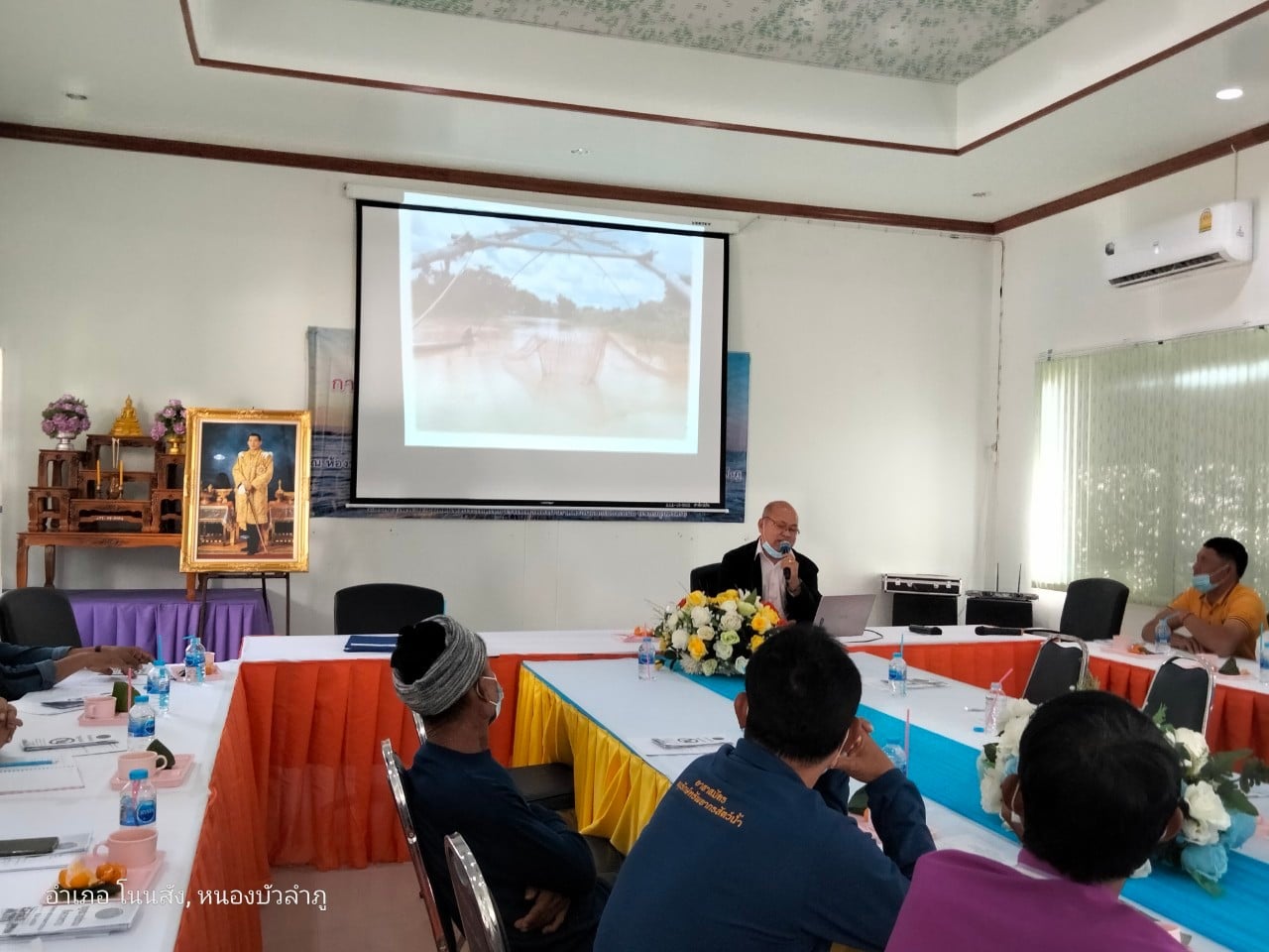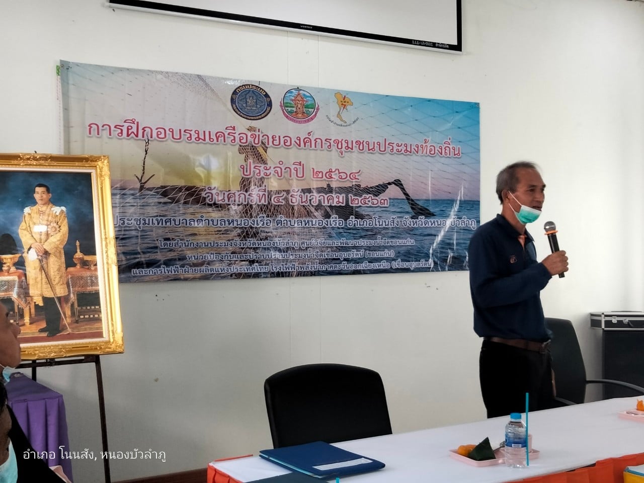 วันที่ 4 ธันวาคม 2563 เวลา 09.00 น. หน่วยงานในสังกัดกรมประมงที่มีแผนปฏิบัติงานในท้องที่จังหวัดหนองบัวลำภู ประกอบด้วยสำนักงานประมงจังหวัดหนองบัวลำภู ศูนย์วิจัยและพัฒนาประมงน้ำจืดขอนแก่น (เขื่อนอุบลรัตน์) หน่วยป้องกันและปราบปรามประมงน้ำจืดเขื่อนอุบลรัตน์(ขอนแก่น) ร่วมกับ การไฟฟ้าภายผลิตแห่งประเทศไทยโรงไฟฟ้าพลังน้ำภาคตะวันออกเฉียงเหนือ(เขื่อนอุบลรัตน์) จัดประชุมองค์กรชุมชนประมงท้องถิ่นจังหวัดหนองบัวลำภู เพื่อสานต่อนโยบายอธิบดีกรมประมง (นายมีศักดิ์ ภักดีคง) ด้านการบริหารจัดการประมงบนพื้นฐานทางวิชาการ กิจกรรมส่งเสริมการสร้างเครือข่ายชุมชนประมงท้องถิ่น ณ ห้องประชุมเทศบาลตำบลหนองเรือ อำเภอโนนสัง จังหวัดหนองบัวลำภู มีผู้แทนองค์กรชุมชนประมงท้องถิ่นเข้าร่วมประชุมองค์กรละ 2 คนรวมทั้งหมด 46 คน เพื่อแลกเปลี่ยนแนวทางการบริหารจัดการด้านการประมงในพื้นที่จังหวัดหนองบัวลำภูโดยเฉพาะอ่างเก็บน้ำขนาดใหญ่ เช่น อ่างเก็บน้ำเขื่อนอุบลรัตน์ อ่างเก็บน้ำห้วยน้ำบอง โดยมีนายเกรียงวิชญ์ เตชวิทยไวทิน รองผู้ว่าราชการจังหวัดหนองบัวลำภู ให้เกียรติเป็นประธานเปิดการฝึกอบรม เสร็จแล้วเยี่ยมชมกลุ่มเกษตรกรดีเด่นระดับประเทศประเภทแปรรูปสัตว์น้ำ ณ กลุ่มเกษตรกรบ้านท่าลาด หมู่ที่ 4 ตำบลหนองเรือ อำเภอโนนสัง จังหวัดหนองบัวลำภู ซึ่งแปรรูปผลิตภัณฑ์สัตว์น้ำประเภทปลาส้มตัว ปลาสวายแดดเดียว ปลาส้มสายเดี่ยว ส้มไข่ปลาและอื่นๆ ด้วยระบบการผลิตที่ได้คุณภาพมาตรฐาน