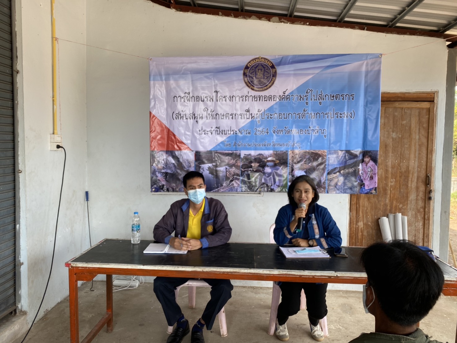 วันที่ 10 กุมภาพันธ์ 2564 นางสาวมลฤดี ลิ้มสุวรรณ ประมงอำเภอศรีบุญเรือง พร้อมด้วยเจ้าหน้าที่กลุ่มพัฒนาและส่งเสริมอาชีพการประมง สำนักงานประมงจังหวัดหนองบัวลำภู จัดอบรมโครงการถ่ายทอดองค์ความรู้ไปสู่เกษตรกร (สนับสนุนให้เกษตรกรเป็นผู้ประกอบการด้านการประมง ประจำปีงบประมาณ 2564 ในพื้นที่อำเภอศรีบุญเรือง จังหวัดหนองบัวลำภู