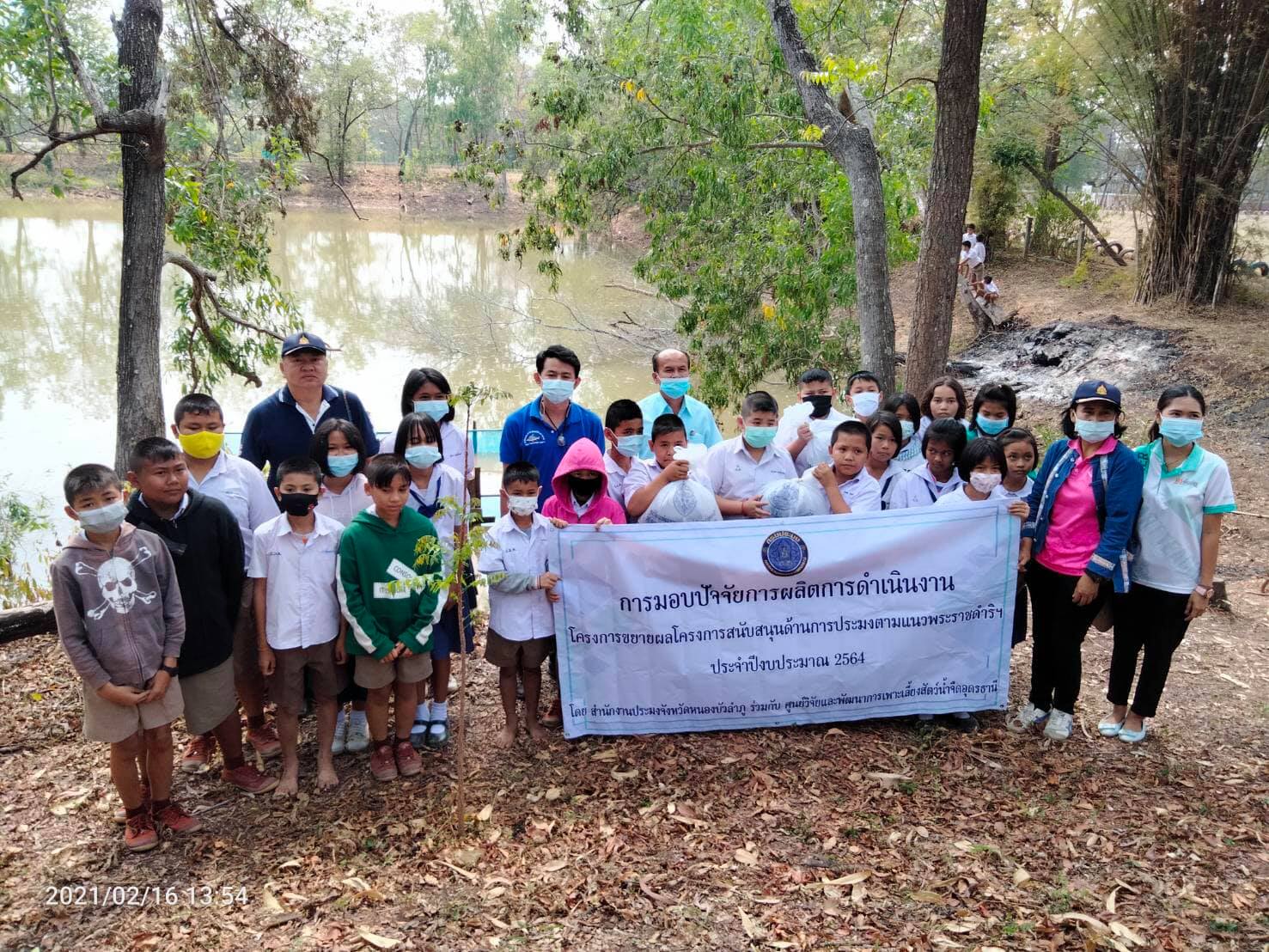วันที่ 17 กุมภาพันธ์ 2564 นายบุญหลาย กุลนารัตน์ ประมงจังหวัดหนองบัวลำภู มอบหมายให้ นายสมจิตร์ พงษ์ภุมมา หัวหน้ากลุ่มบริหารจัดการด้านการประมง พร้อมด้วย นางสาวมลฤดี ลิ้มสุวรรณ ประมงอำเภอศรีบุญเรือง และเจ้าหน้าที่สำนักงานประมงจังหวัดหนองบัวลำภู ร่วมกับศูนย์วิจัยและพัฒนาการเพาะเลี้ยงสัตว์น้ำจืดอุดรธานี ดำเนินงานโครงการขยายผลโครงการพระราชดําริฯ โครงการสนับสนุนด้านการประมง ตามพระราชดำริ สมเด็จพระกนิษฐาธิราชเจ้า กรมสมเด็จพระเทพรัตนราชสุดาฯ สยามบรมราชกุมารี เพื่อมอบปัจจัยการผลิต เป็นพันธุ์ปลานิลจำนวน 5,000 ให้กับโรงเรียนบ้านหนองม่วงชมพูทอง หมู่ที่ 5 ตำบลเมืองใหม่ อำเภอศรีบุญเรือง พร้อมให้คำแนะนำการจับผลผลิตในแหล่งน้ำที่ได้ขนาดเพื่อสนับสนุนโครงการอาหารกลางวันให้กับเด็กนักเรียน