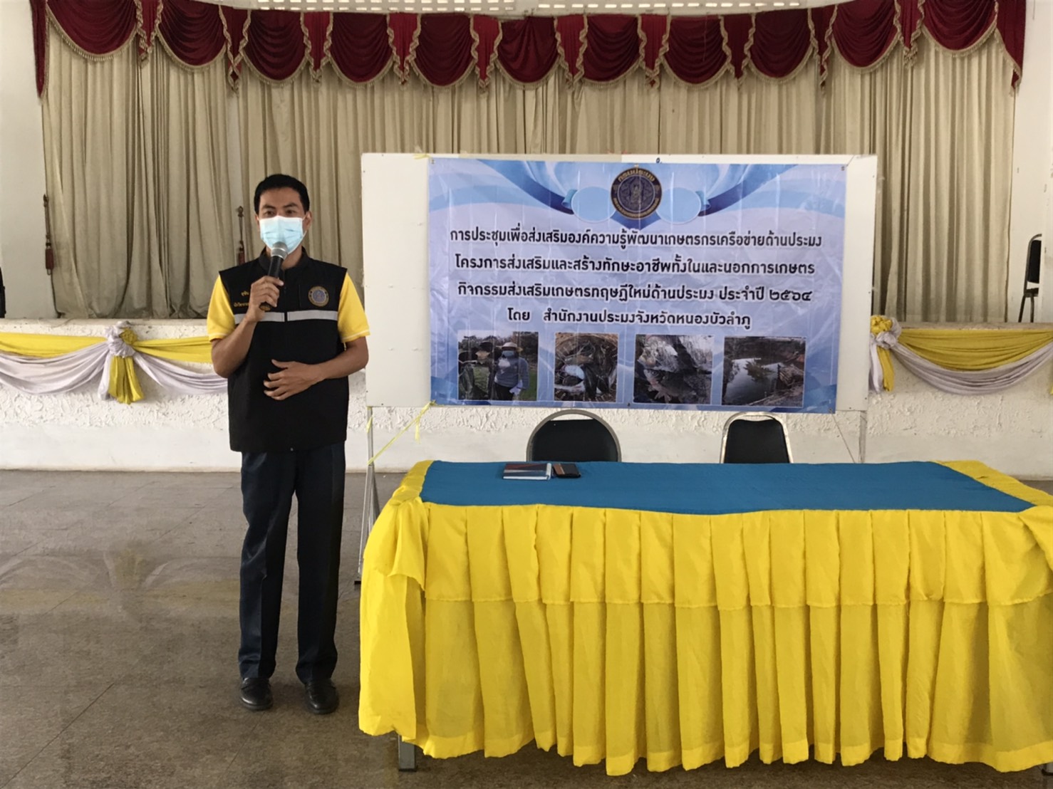 วันที่ 19 กุมภาพันธ์ 2564 นายประหยัด ยืดยาวประมงอำเภอเมืองหนองบัวลำภู พร้อมด้วยนายสุชิน มิ่งไชย นักวิชาการประมงปฏิบัติการ และเจ้าหน้าที่กลุ่มพัฒนาและส่งเสริมอาชีพการประมง จัดฝึกอบรมโครงการส่งเสริมและสร้างทักษะในการประกอบอาชีพทั้งในและนอกการเกษตรกิจกรรมส่งเสริมเกษตรทฤษฎีใหม่ด้านประมงประจำปีงบประมาณ 2564 จำนวน 15 รายในพื้นที่อำเภอเมืองหนองบัวลำภู จังหวัดหนองบัวลำภู โดยมีนายบุญหลาย กุลนารัตน์ ประมงจังหวัดหนองบัวลำภู ร่วมเป็นเกียรติด้วย