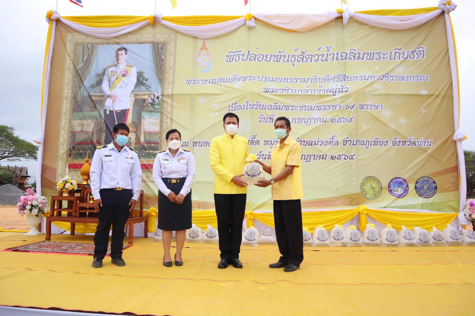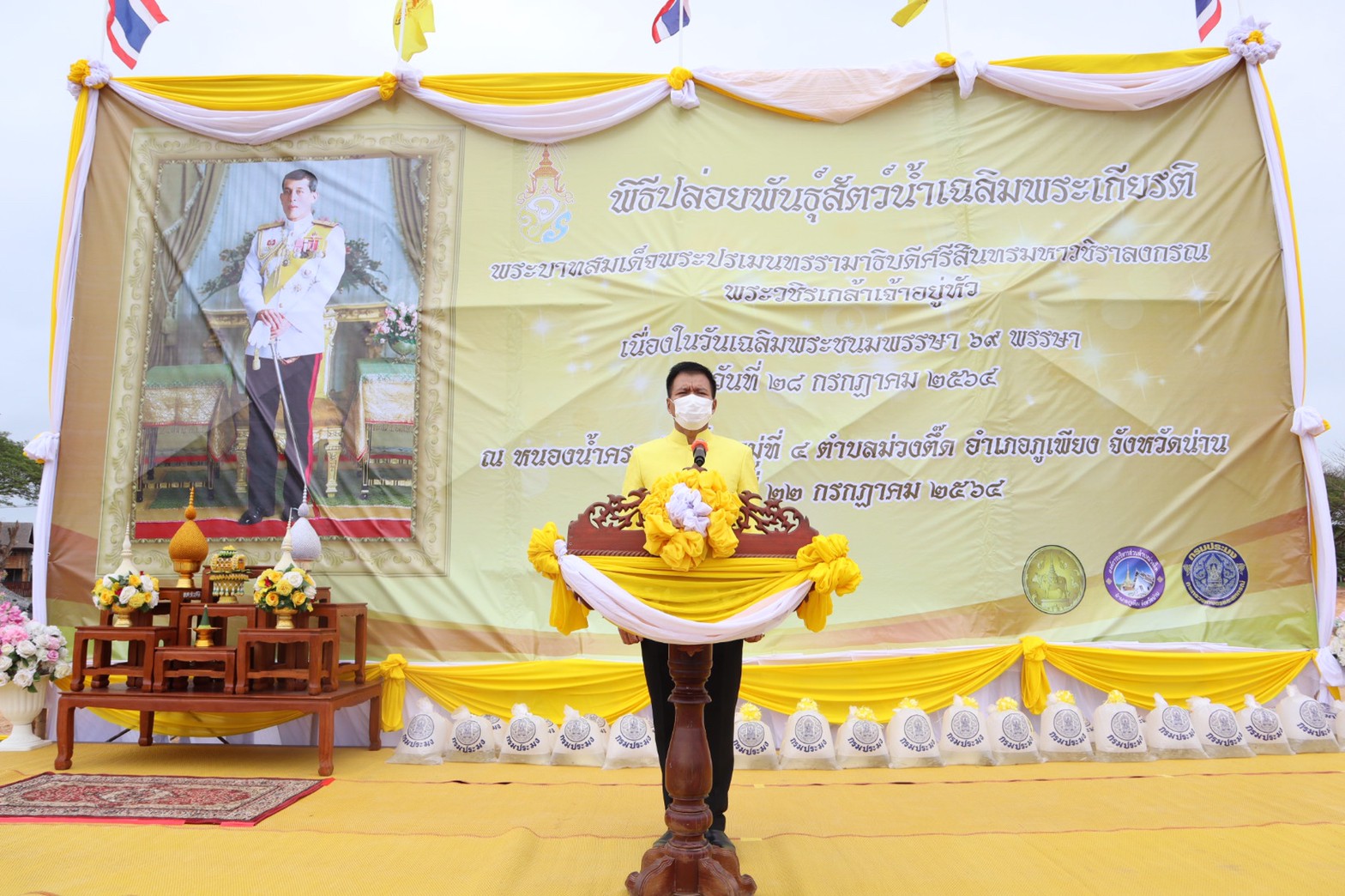 วันพฤหัสบดีที่ 22 กรกฎาคม 2564 จังหวัดน่าน โดยสำนักงานประมงจังหวัดน่าน ร่วมกับศูนย์วิจัยและพัฒนาการเพาะเลี้ยงสัตว์น้ำจืดน่าน อำเภอภูเพียง และองค์การบริหารส่วนตำบลม่วงตึ๊ด จัดพิธีปล่อยพันธุ์สัตว์น้ำเฉลิมพระเกียรติ เนื่องในโอกาสวันคล้ายวันเฉลิมพระชนมพรรษา พระบาทสมเด็จพระปรเมนทรรามาธิบดีศรีสินทรมหาวชิราลงกรณ พระวชิรเกล้าเจ้าอยู่หัว 28 กรกฎาคม 2564 ณ หนองน้ำครกม่วงตึ๊ด หมู่ที่ 4 ตำบลม่วงตึ๊ด อำเภอภูเพียง จังหวัดน่าน โดยมีนายนิพันธ์ บุญหลวง ผู้ว่าราชการจังหวัดน่าน เป็นประธานในพิธี และรองผู้ว่าราชการจังหวัดน่านทั้ง 3 ท่าน พร้อมด้วยหัวหน้าส่วนราชการต่างๆ และพี่น้องประชาชน จำนวน 150 คน ร่วมในพิธีดังกล่าว
