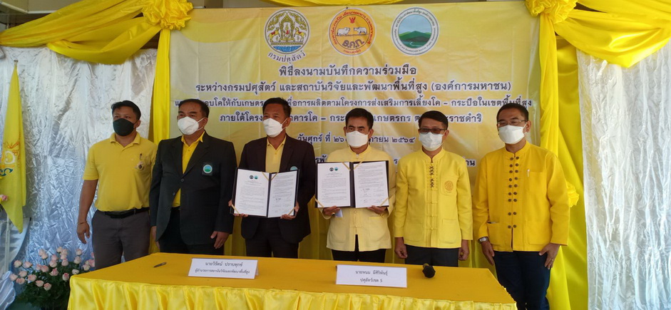 วันศุกร์ที่ ๒๖ พฤศจิกายน ๒๕๖๔  เวลา ๐๙.๐๙ น. นางชยาพร เตียเจริญวงศ์ ประมงจังหวัดน่าน มอบหมายให้ นายสมชาติ ธรรมขันทา หัวหน้ากลุ่มพัฒนาและส่งเสริมอาชีพการประมง ร่วมพิธีมอบ โคกระบือพระราชทานและทำพิธีลงนามบันทึกความเข้าใจเพื่อส่งเสริมและสนับสนุนการวิจัยและพัฒนางานโครงการธนาคารโค  กระบือ เพื่อเกษตรกร ตามพระราชดำริ ในเขตพื้นที่สูง ณ สำนักงานโครงการพัฒนาพื้นที่สูงแบบโครงการหลวงลุ่มน้ำน่าน สถาบันวิจัยและพัฒนาพื้นที่สูง (องค์การมหาชน)  ตำบลฝายแก้ว อำเภอภูเพียง จังหวัดน่าน โดยมี นายวิรัตน์ ปราบทุกข์ ผู้อำนวยการสถาบันวิจัยและพัฒนาพื้นที่สูง นายธีรวิทย์ ขาวบุปผา ผู้อำนวยการกองงานพระราชดำริและกิจกรรมพิเศษ (พยาน) นางสาวเพชรดา อยู่สุข รองผู้อำนวนการสถานบันวิจัยและพัฒนาพื้นที่สูงด้านการพัฒนา (พยาน) นายนพดล พินิจ ปศุสัตว์จังหวัดน่าน (พยาน) และ นางสาวอัจฉรา ภาวศุทธิ์ ผู้อำนวยการสำนักวิจัยสถาบันวิจัยและพัฒนาพื้นที่สูง (องค์การมหาชน) (พยาน) ลงนามบันทึกความเข้าใจร่วมกัน
