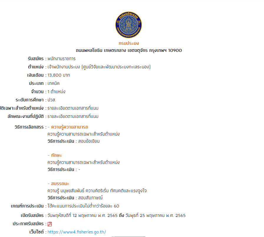2. รับสมัครพนักงานราชการ ตำแหน่งเจ้าพนักงานประมง สังกัด ศูนย์วิจัยและพัฒนาประมงทะเลระนอง ระหว่างวันที่ 12 - 25 พฤษภาคม 2565