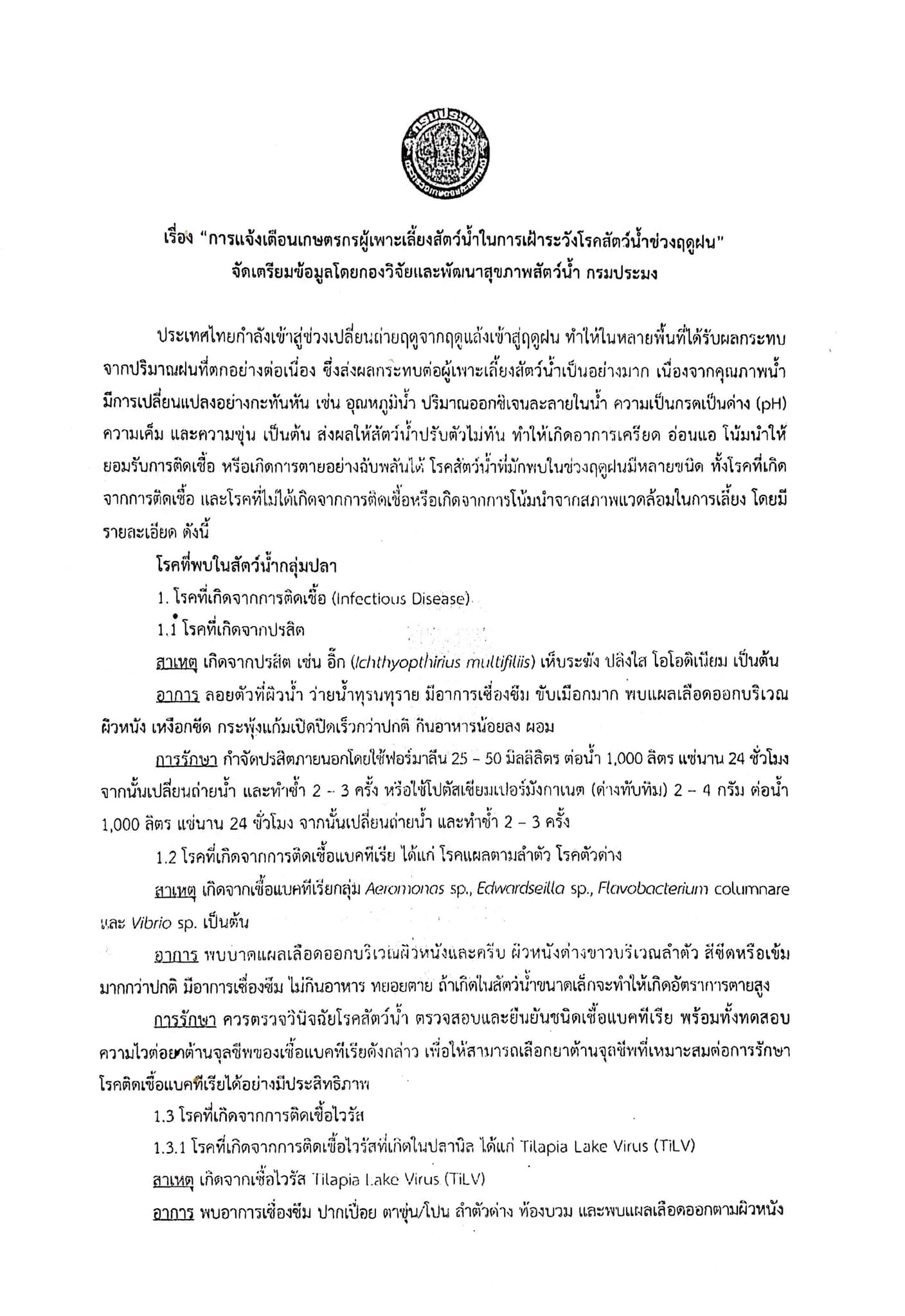 การแจ้งเตือนเกษตรกรผู้เพาะเลี้ยงสัตว์น้ำในการเฝ้าระวังสัตว์น้ำช่วงฤดูฝน..คลิก