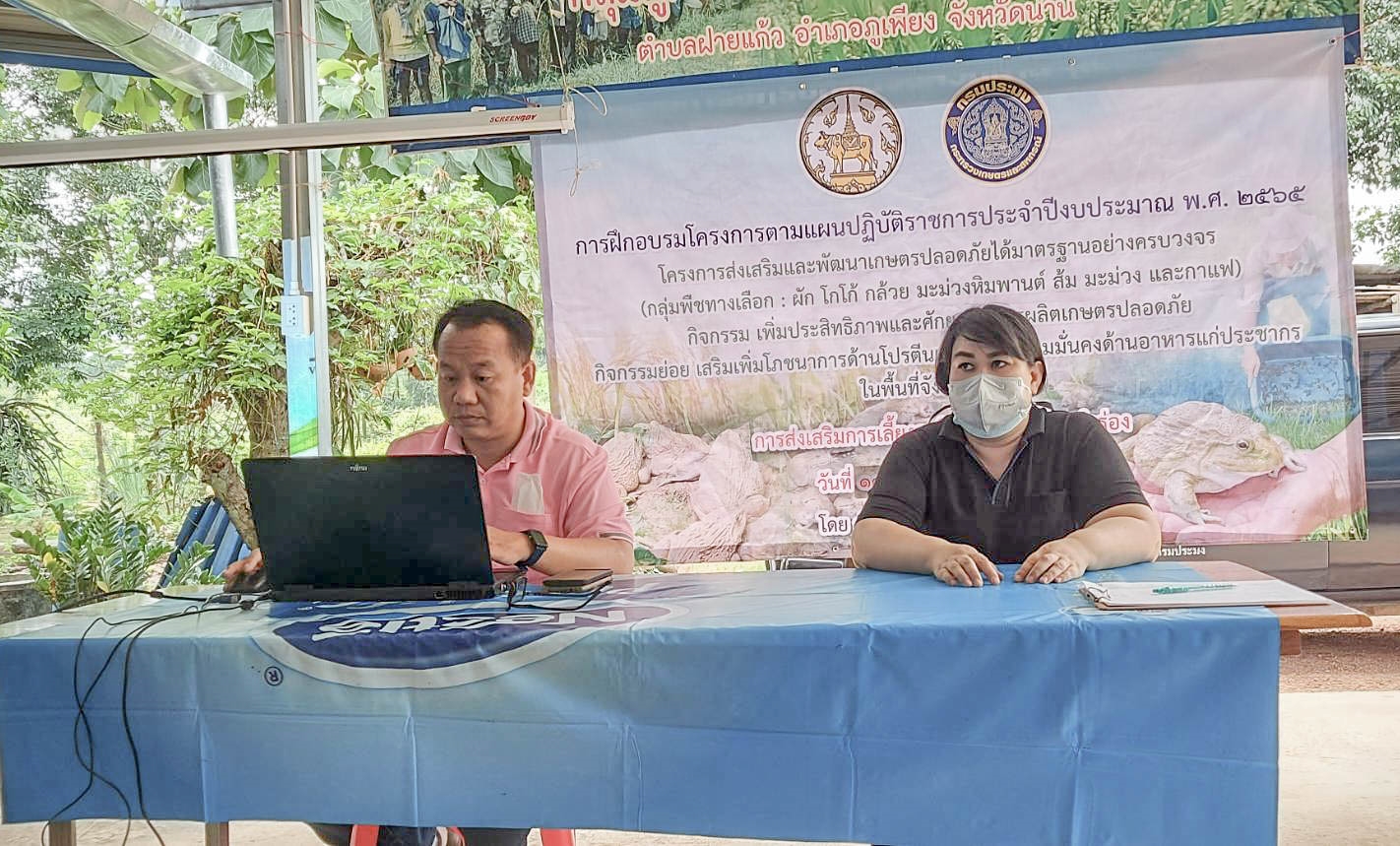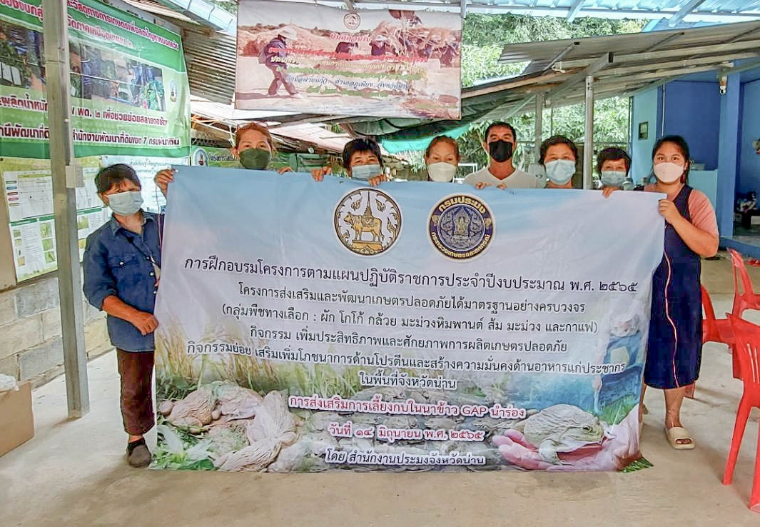 วันอังคารที่ 14 มิถุนายน 2565 นางชยาพร เตียเจริญวงศ์ ประมงจังหวัดน่าน มอบหมายให้ กลุ่มพัฒนาและส่งเสริมอาชีพการประมง พร้อมด้วยนายเอกพงศ์ ไชยช่อฟ้า ประมงอำเภอเมืองน่าน ดำเนินการจัดฝึกอบรมโครงการ ส่งเสริมการเลี้ยงกบในนาข้าว GAP นำร่อง งบพัฒนาจังหวัด ปี 2565 ให้แก่เกษตรกรกลุ่มผู้ปลูกข้าว GAP ณ ตำบลฝายแก้ว อำเภอภูเพียง จังหวัดน่าน โดยมีเกษตรกรเข้าร่วมฝึกอบรม จำนวน 2 รุ่น รุ่นละ 10 ราย รวมจำนวนเกษตรเข้าฝึกอบรมทั้งสิ้น 20 ราย