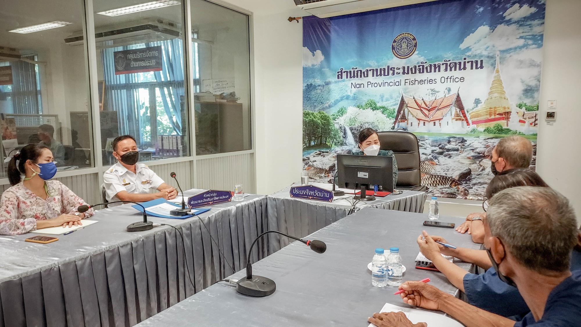 วันอังคารที่ 21 มิถุนายน 2565 เวลา 09.00 น. สำนักงานประมงจังหวัดน่าน จัดประชุมติดตามความก้าวหน้า พร้อมมอบแนวทางการปฏิบัติงานการดำเนินโครงการศูนย์เรียนรู้การเพิ่มประสิทธิภาพการผลิตสินค้าเกษตร (ศพก.) ด้านประมง ประจำปีงบประมาณ ๒๕๖๕ กิจกรรมยกระดับ ศพก.เครือข่ายด้านประมง เพื่อให้เป็นศุูนย์เรียนรู้ฯ ต้นแบบด้านประมงในพื้นที่จังหวัดน่าน ณ ห้องประชุมสำนักงานประมงจังหวัดน่าน สำนักงานประมงจังหวัดน่าน ชั้น 2 ศาลากลางจังหวัดน่าน อําเภอเมือง จังหวัดน่าน โดยมี นางชยาพร  เตียเจริญวงศ์ ประมงจังหวัดน่าน เป็นประธานในการประชุม