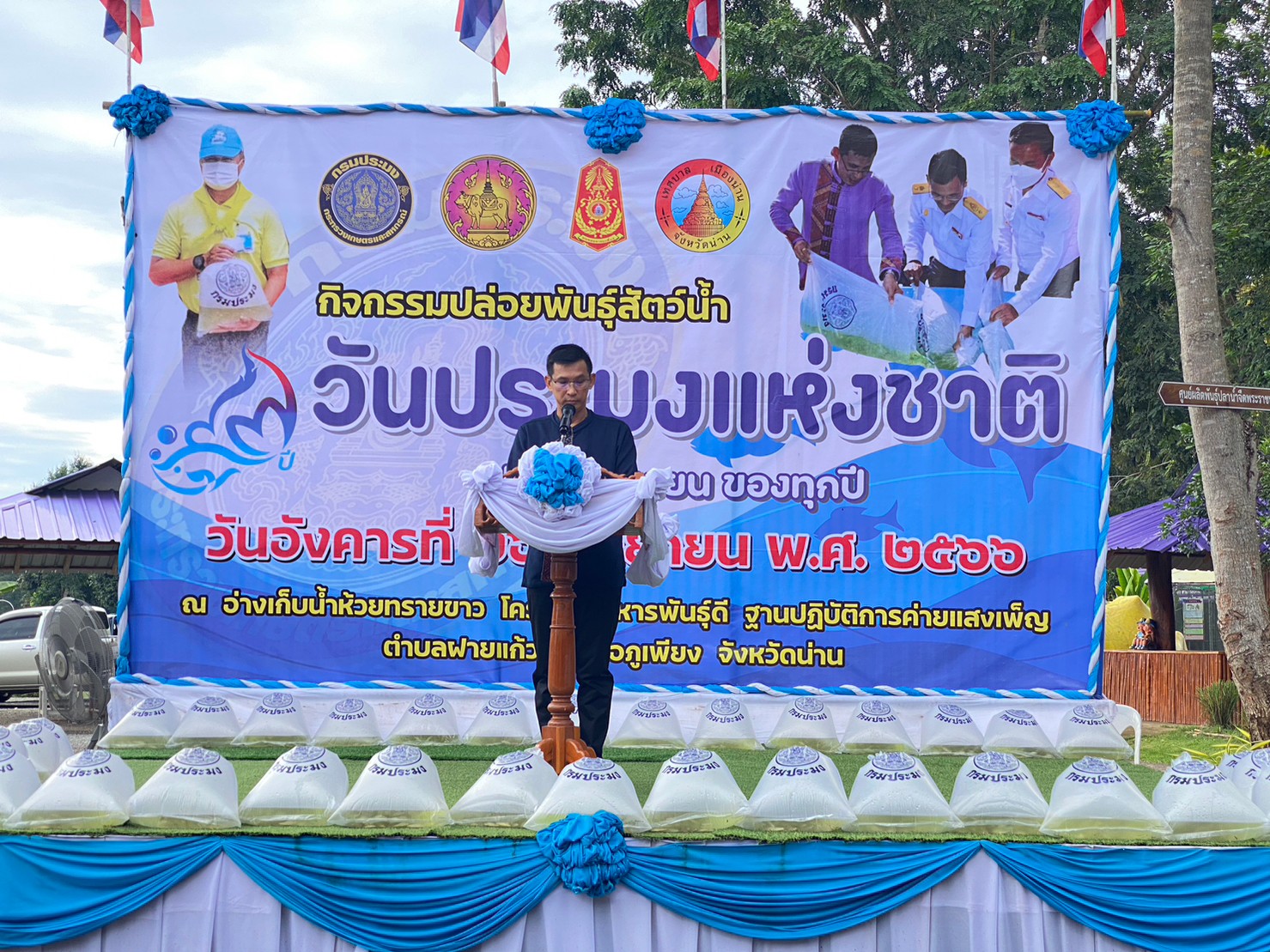 วันอังคารที่ 26 กันยายน 2566 เวลา 09.00 น. หน่วยงานกรมประมงในพื้นที่จังหวัดน่าน ร่วมกับ มณฑลทหารบกที่ 38 อำเภอภูเพียง และเทศบาลเมืองน่าน จัดกิจกรรมปล่อยพันธุ์สัตว์น้ำ เนื่องในวันประมงแห่งชาติ ประจำปี 2566 และโครงการปล่อยพันธุ์สัตว์น้ำในลุ่มน้ำสำคัญของประเทศ 62 จังหวัด 62 ล้านตัว ตามนโยบายเร่งด่วนของรัฐบาลนายกรัฐมนตรีเศรษฐา ทวีสิน ณ อ่างเก็บน้ำห้วยทรายขาว โครงการทหารพันธุ์ดี ฐานปฏิบัติการค่ายแสงเพ็ญ ตำบลฝายแก้ว อำเภอภูเพียง จังหวัดน่าน ซึ่งได้รับการสนับสนุนพันธุ์สัตว์น้ำจากศูนย์วิจัยและพัฒนาประมงน้ำจืดน่าน จำนวนทั้งสิ้น 300,000 ตัว ได้แก่ ปลาตะเพียนขาว จำนวน 200,000 ตัว และปลาสร้อยขาว จำนวน 1000,000 ตัว ซึ่งในกิจกรรมได้มีการจัดจำหน่ายผลิตภัณฑ์สินค้า Fisherman Shop@Nan และผลิตภัณฑ์ของโครงการทหารพันธุ์ดี โดยมีนายวิบูรณ์ แววบัณฑิต ผู้ว่าราชการจังหวัดน่าน เป็นประธานในกิจกรรมวันอังคารที่ 26 กันยายน 2566 เวลา 09.00 น. หน่วยงานกรมประมงในพื้นที่จังหวัดน่าน ร่วมกับ มณฑลทหารบกที่ 38 อำเภอภูเพียง และเทศบาลเมืองน่าน จัดกิจกรรมปล่อยพันธุ์สัตว์น้ำ เนื่องในวันประมงแห่งชาติ ประจำปี 2566 และโครงการปล่อยพันธุ์สัตว์น้ำในลุ่มน้ำสำคัญของประเทศ 62 จังหวัด 62 ล้านตัว ตามนโยบายเร่งด่วนของรัฐบาลนายกรัฐมนตรีเศรษฐา ทวีสิน ณ อ่างเก็บน้ำห้วยทรายขาว โครงการทหารพันธุ์ดี ฐานปฏิบัติการค่ายแสงเพ็ญ ตำบลฝายแก้ว อำเภอภูเพียง จังหวัดน่าน ซึ่งได้รับการสนับสนุนพันธุ์สัตว์น้ำจากศูนย์วิจัยและพัฒนาประมงน้ำจืดน่าน จำนวนทั้งสิ้น 300,000 ตัว ได้แก่ ปลาตะเพียนขาว จำนวน 200,000 ตัว และปลาสร้อยขาว จำนวน 1000,000 ตัว ซึ่งในกิจกรรมได้มีการจัดจำหน่ายผลิตภัณฑ์สินค้า Fisherman Shop@Nan และผลิตภัณฑ์ของโครงการทหารพันธุ์ดี โดยมีนายวิบูรณ์ แววบัณฑิต ผู้ว่าราชการจังหวัดน่าน เป็นประธานในกิจกรรม