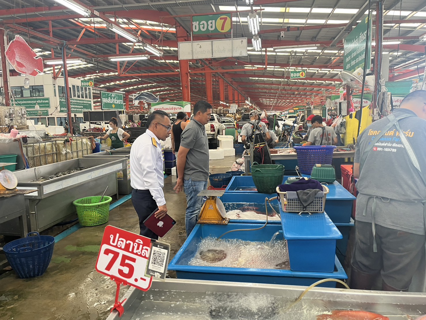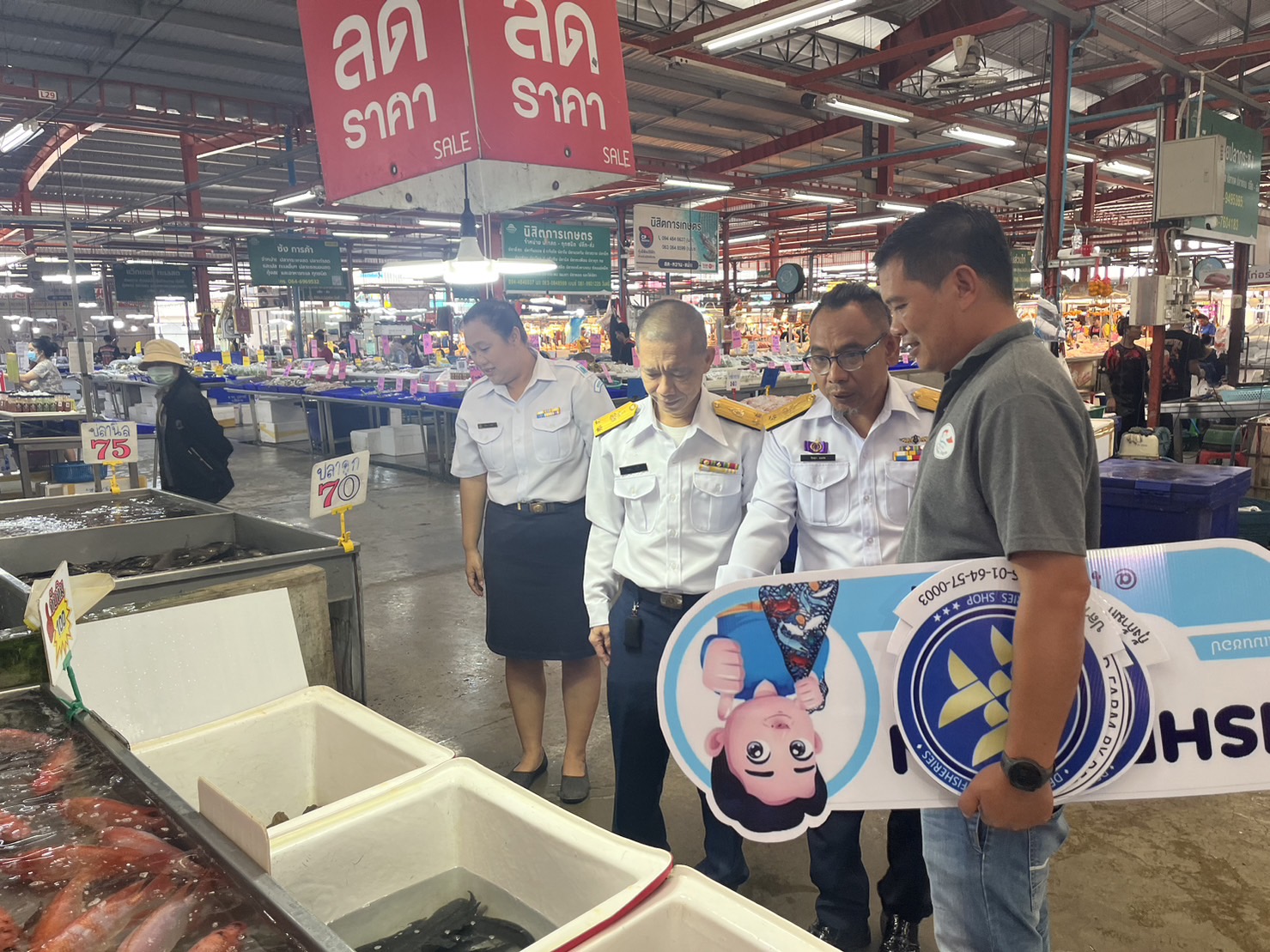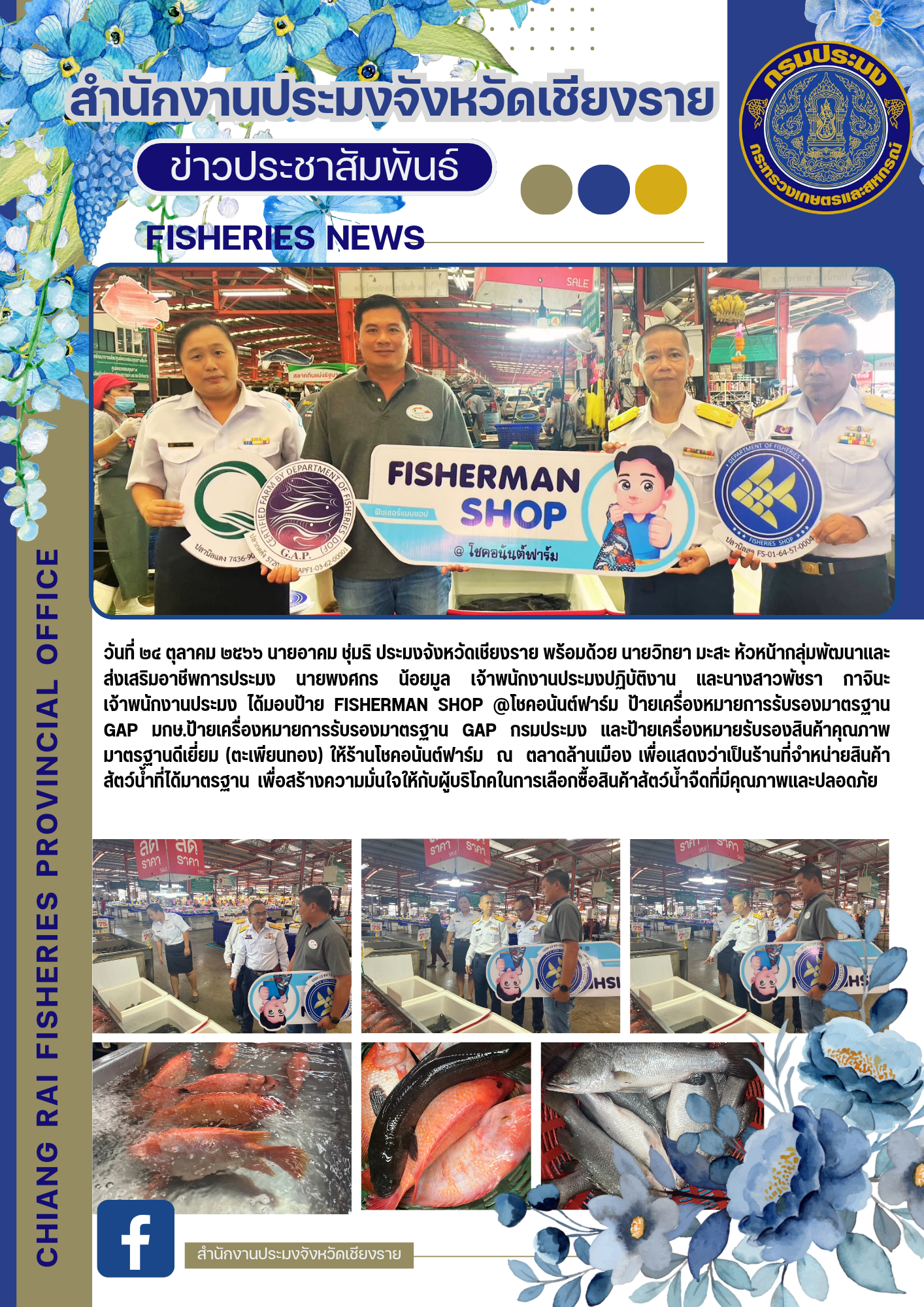 วันที่ ๒๔ ตุลาคม ๒๕๖๖ นายอาคม ชุ่มธิ ประมงจังหวัดเชียงราย พร้อมด้วย นายวิทยา มะสะ หัวหน้ากลุ่มพัฒนาและส่งเสริมอาชีพการประมง นายพงศกร น้อยมูลเจ้าพนักงานประมงปฏิบัติงาน และนางสาวพัชรา กาจินะ  เจ้าพนักงานประมง ได้มอบป้าย FISHERMAN SHOP @โชคอนันต์ฟาร์ม ป้ายเครื่องหมายการรับรองมาตรฐาน GAP มกษ.ป้ายเครื่องหมายการรับรองมาตรฐาน GAP กรมประมง และป้ายเครื่องหมายรับรองสินค้าคุณภาพมาตรฐานดีเยี่ยม (ตะเพียนทอง) ให้ร้านโชคอนันต์ฟาร์ม ณ ตลาดล้านเมือง เพื่อแสดงว่าเป็นร้านที่จำหน่ายสินค้าสัตว์น้ำ ที่ได้มาตรฐาน เพื่อสร้างความมั่นใจให้กับผู้บริโภคในการเลือกซื้อสินค้าสัตว์น้ำจืดที่มีคุณภาพและปลอดภัย