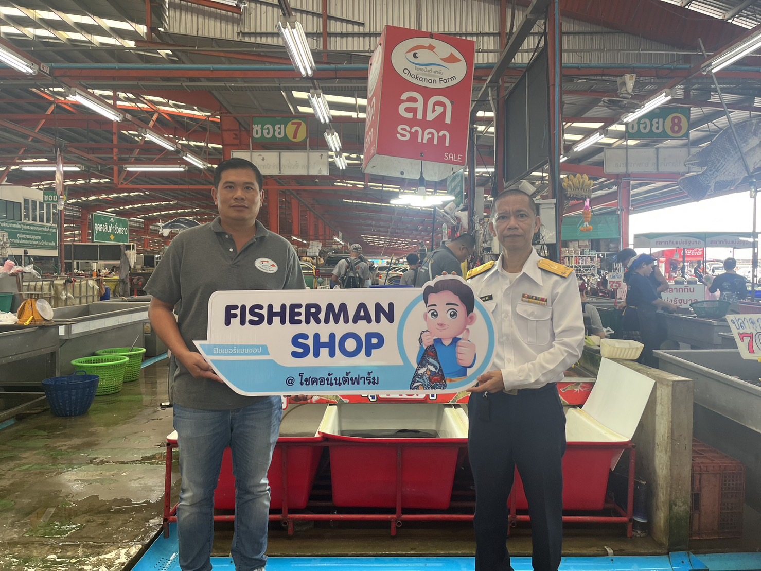 มอบป้าย FISHERMAN SHOP และป้ายเครื่องหมายการรับรองมาตรฐาน GAP มกษ. , GAP กรมประมง และป้ายเครื่องหมายรับรองสินค้า คุณภาพมาตรฐานดีเยี่ยม (ตะเพียนทอง) ให้ร้านโชคอนันต์ฟาร์ม