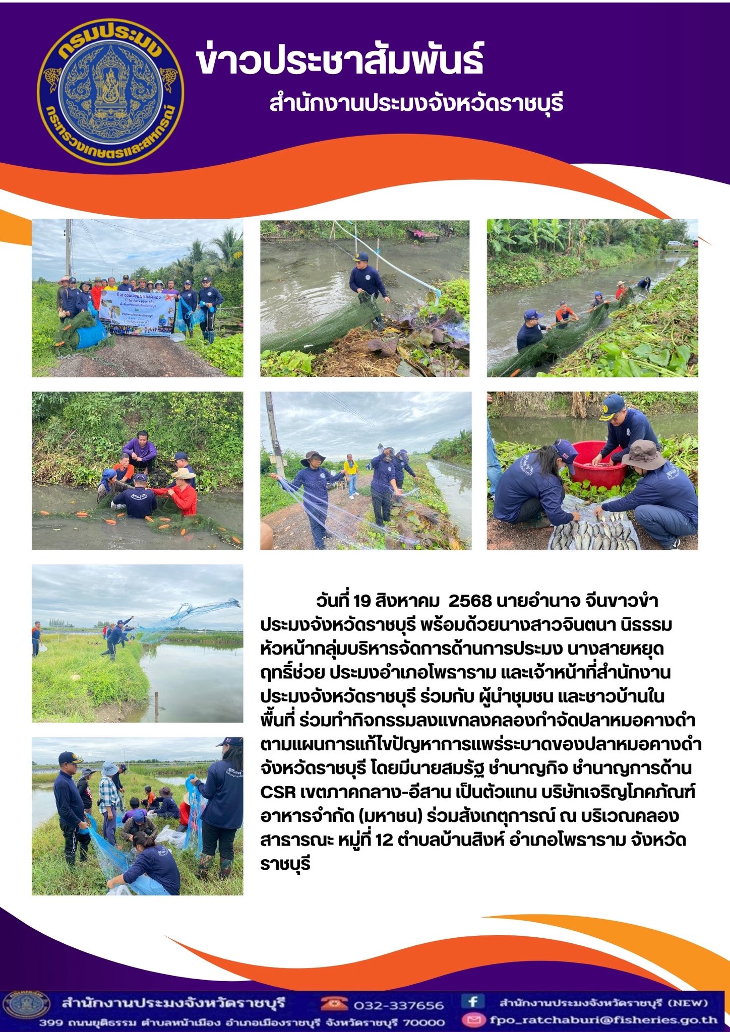 วันที่ 19 สิงหาคม 2568 นายอำนาจ จีนขาวขำ ประมงจังหวัดราชบุรี พร้อมด้วย นางสาวจินตนา นิธรรม หัวหน้ากลุ่มบริหารจัดการด้านการประมง นางสายหยุด ฤทธิ์ช่วย ประมงอำเภอโพธาราม และเจ้าหน้าที่สำนักงานประมงจังหวัดราชบุรี ร่วมกับ ผู้นำชุมชน และชาวบ้านในพื้นที่ ร่วมทำกิจกรรมลงแขกลงคลองกำจัดปลาหมอคางดำ ตามแผนการแก้ไขปัญหาการแพร่ระบาดของปลาหมอคางดำจังหวัดราชบุรี โดยมีนายสมรัฐ ชำนาญกิจ ชำนาญการด้าน CSR เขตภาคกลาง-อีสาน เป็นตัวแทน บริษัทเจริญโภคภัณฑ์อาหารจำกัด (มหาชน) ร่วมสังเกตุการณ์ ณ บริเวณคลองสาธารณะ หมู่ที่ 12 ตำบลบ้านสิงห์ อำเภอโพธาราม จังหวัดราชบุรี