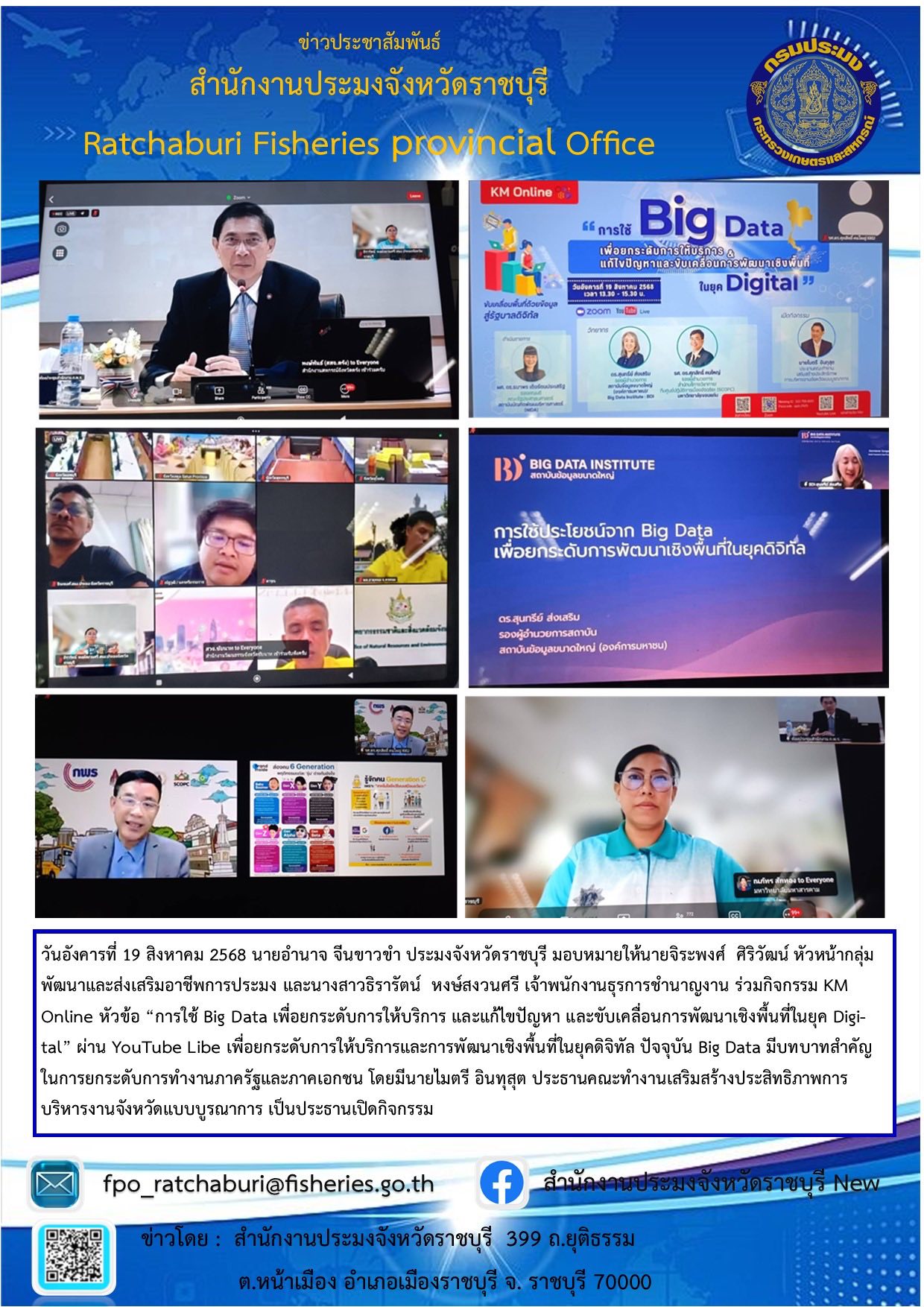 วันอังคารที่ 19 สิงหาคม 2568 นายอำนาจ จีนขาวขำ ประมงจังหวัดราชบุรี มอบหมายให้นายจิระพงศ์ ศิริวัฒน์ หัวหน้ากลุ่มพัฒนาและส่งเสริมอาชีพการประมง และนางสาวธิรารัตน์ หงษ์สงวนศรี เจ้าพนักงานธุรการชำนาญงาน ร่วมกิจกรรม KM Online หัวข้อ “การใช้ Big Data เพื่อยกระดับการให้บริการ และแก้ไขปัญหา และขับเคลื่อนการพัฒนาเชิงพื้นที่ในยุค Digital” ผ่าน YouTube Libe เพื่อยกระดับการให้บริการและการพัฒนาเชิงพื้นที่ในยุคดิจิทัล ปัจจุบัน Big Data มีบทบาทสำคัญในการยกระดับการทำงานภาครัฐและภาคเอกชน โดยมีนายไมตรี อินทุสุต ประธานคณะทำงานเสริมสร้างประสิทธิภาพการบริหารงานจังหวัดแบบบูรณาการ เป็นประธานเปิดกิจกรรม