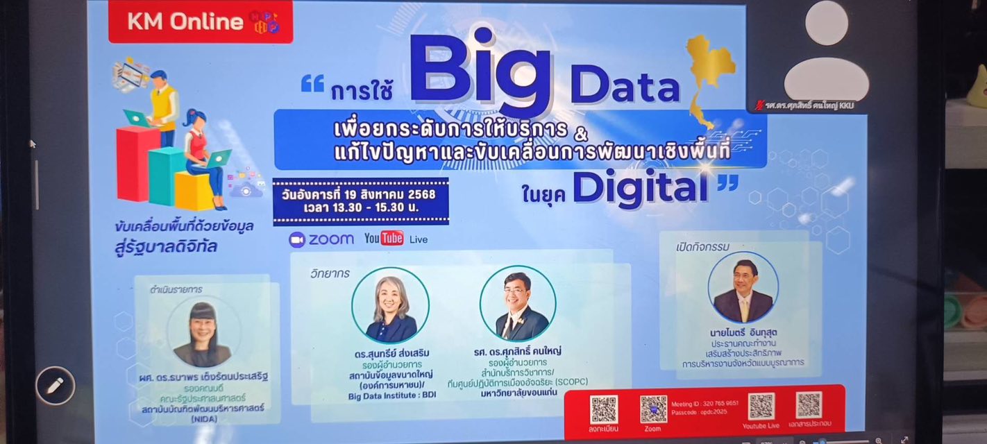 ร่วมกิจกรรม KM Online หัวข้อ “การใช้ Big Data เพื่อยกระดับการให้บริการ และแก้ไขปัญหา และขับเคลื่อนการพัฒนาเชิงพื้นที่ในยุค Digital” ผ่าน YouTube Libe..คลิก