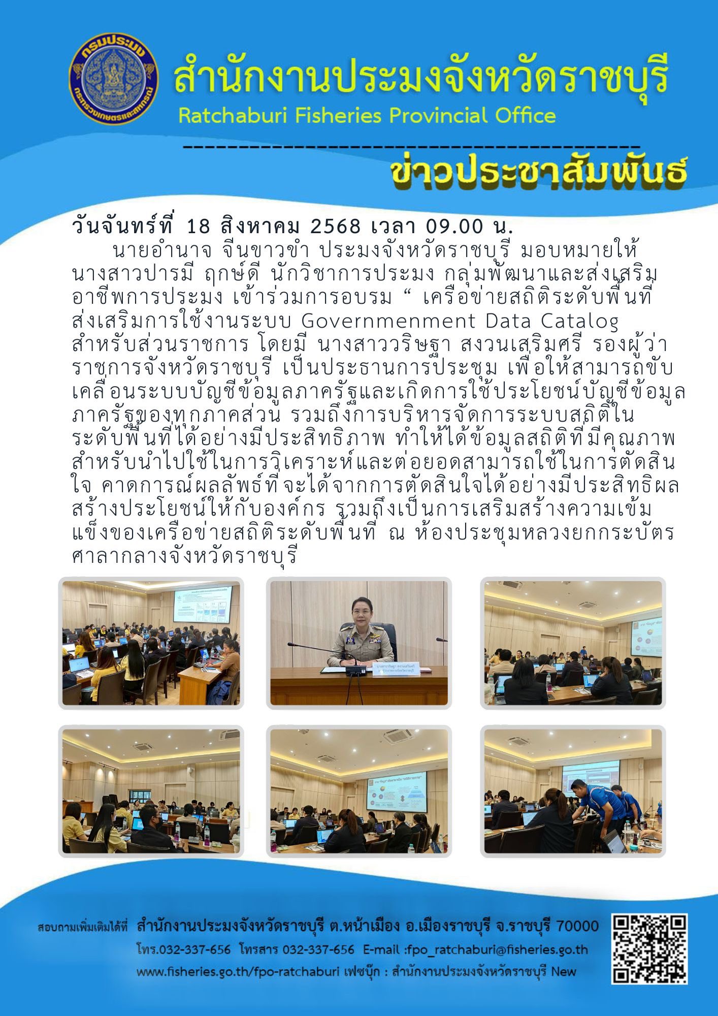 วันที่ 18 สิงหาคม 2568 เวลา 09.00 น. นายอำนาจ จีนขาวขำ ประมงจังหวัดราชบุรี มอบหมายให้ นางสาวปารมี ฤกษ์ดี นักวิชาการประมง กลุ่มพัฒนาและส่งเสริมอาชีพการประมง เข้าร่วมการอบรม “ เครือข่ายสถิติระดับพื้นที่ ส่งเสริมการใช้งานระบบ Governmenment Data Catalog สำหรับส่วนราชการ โดยมี นางสาววริษฐา สงวนเสริมศรี รองผู้ว่าราชการจังหวัดราชบุรี เป็นประธานการประชุม เพื่อให้สามารถขับเคลื่อนระบบบัญชีข้อมูลภาครัฐและเกิดการใช้ประโยชน์บัญชีข้อมูลภาครัฐของทุกภาคส่วน รวมถึงการบริหารจัดการระบบสถิติในระดับพื้นที่ได้อย่างมีประสิทธิภาพ ทำให้ได้ข้อมูลสถิติที่มีคุณภาพสำหรับนำไปใช้ในการวิเคราะห์และต่อยอดสามารถใช้ในการตัดสินใจ คาดการณ์ผลลัพธ์ที่จะได้จากการตัดสินใจได้อย่างมีประสิทธิผลสร้างประโยชน์ให้กับองค์กร รวมถึงเป็นการเสริมสร้างความเข้มแข็งของเครือข่ายสถิติระดับพื้นที่ ณ ห้องประชุมหลวงยกกระบัตร ศาลากลางจังหวัดราชบุรี