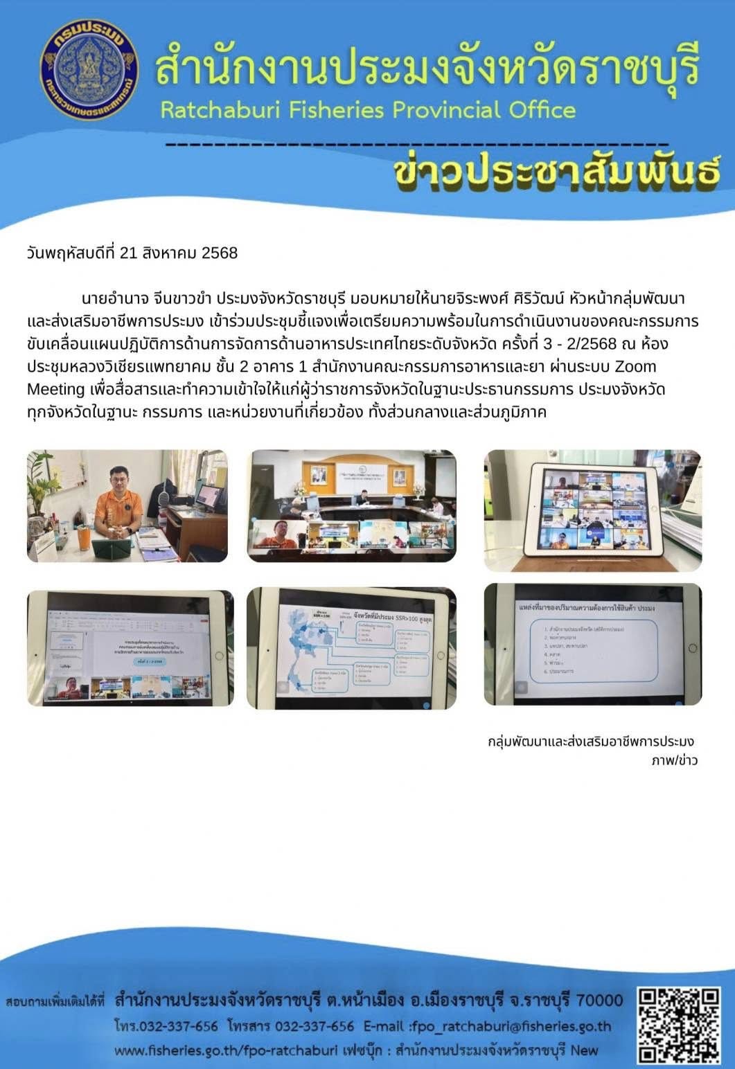 วันพฤหัสบดีที่ 21 สิงหาคม 2568 นายอำนาจ จีนขาวขำ ประมงจังหวัดราชบุรี มอบหมายให้นายจิระพงศ์ ศิริวัฒน์ หัวหน้ากลุ่มพัฒนาและส่งเสริมอาชีพการประมง เข้าร่วมประชุมชี้แจงเพื่อเตรียมความพร้อมในการดำเนินงานของคณะกรรมการขับเคลื่อนแผนปฏิบัติการด้านการจัดการด้านอาหารประเทศไทยระดับจังหวัด ครั้งที่ 3 - 2/2568 ณ ห้องประชุมหลวงวิเชียรแพทยาคม ชั้น 2 อาคาร 1 สำนักงานคณะกรรมการอาหารและยา ผ่านระบบ Zoom Meeting เพื่อสื่อสารและทำความเข้าใจให้แก่ผู้ว่าราชการจังหวัดในฐานะประธานกรรมการ ประมงจังหวัดทุกจังหวัดในฐานะ กรรมการ และหน่วยงานที่เกี่ยวข้อง ทั้งส่วนกลางและส่วนภูมิภาค