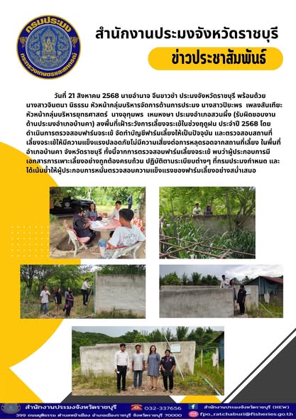 วันที่ 21 สิงหาคม 2568 นายอำนาจ จีนขาวขำ ประมงจังหวัดราชบุรี พร้อมด้วย นางสาวจินตนา นิธรรม หัวหน้ากลุ่มบริหารจัดการด้านการประมง นางสาวปิยะพร เพลงสันเทียะ หัวหน้ากลุ่มบริหารยุทธศาสตร์ นางอุทุมพร เหมหงษา ประมงอำเภอสวนผึ้ง (รับผิดชอบงานด้านประมงอำเภอบ้านคา) ลงพื้นที่เฝ้าระวังการเลี้ยงจระเข้ในช่วงฤดูฝน ประจำปี 2568 โดยดำเนินการตรวจสอบฟาร์มจระเข้ จัดทำบัญชีฟาร์มเลี้ยงให้เป็นปัจจุบัน และตรวจสอบสถานที่เลี้ยงจระเข้ให้มีความแข็งแรงปลอดภัยไม่มีความเสี่ยงต่อการหลุดรอดจากสถานที่เลี้ยง ในพื้นที่อำเภอบ้านคา จังหวัดราชบุรี ทั้งนี้จากการตรวจสอบฟาร์มเลี้ยงจระเข้ พบว่าผู้ประกอบการมีเอกสารการเพาะเลี้ยงอย่างถูกต้องครบถ้วน ปฏิบัติตามระเบียบต่างๆ ที่กรมประมงกำหนด และได้เน้นย้ำให้ผู้ประกอบการหมั่นตรวจสอบความแข็งแรงของฟาร์มเลี้ยง อย่างสม่ำเสมอ
