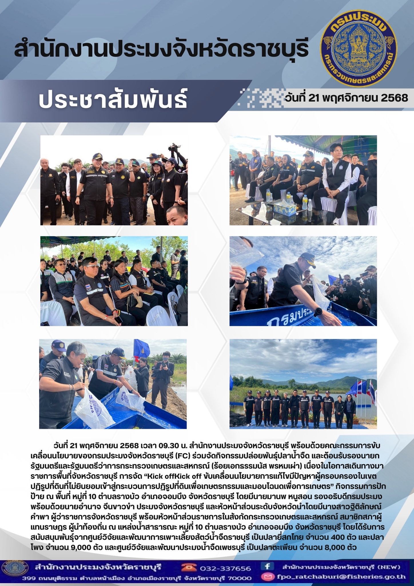 วันที่ 21 พฤศจิกายน 2568 เวลา 09.30 น. สำนักงานประมงจังหวัดราชบุรี พร้อมด้วยคณะกรรมการขับเคลื่อนนโยบายของกรมประมงจังหวัดราชบุรี (FC) ร่วมจัดกิจกรรมปล่อยพันธุ์ปลาน้ำจืด และต้อนรับรองนายกรัฐมนตรีและรัฐมนตรีว่าการกระทรวงเกษตรและสหกรณ์ (ร้อยเอกธรรมนัส พรหมเผ่า) เนื่องในโอกาสเดินทางมาราชการพื้นที่จังหวัดราชบุรี การจัด “Kick offKick off ขับเคลื่อนนโยบายการแก้ไขมีปัญหาผู้ครอบครองในเขตปฏิรูปที่ดินที่ไม่ยินยอมเข้าสู่กระบวนการปฏิรูปที่ดินเพื่อเกษตรกรรมและมอบโฉนดเพื่อการเกษตร” กิจกรรมการปักป้าย ณ พื้นที่ หมู่ที่ 10 ตำบลรางบัว อำเภอจอมบึง จังหวัดราชบุรี โดยมีนายมานพ หนูสอน รองอธิบดีกรมประมง พร้อมด้วยนายอำนาจ จีนขาวขำ ประมงจังหวัดราชบุรี และหัวหน้าส่วนระดับจังหวัดนำโดยมีนางสาวฐิติลักษณ์ คำพา ผู้ว่าราชการจังหวัดราชบุรี พร้อมหัวหน้าส่วนราชการในสังกัดกระทรวงเกษตรและสหกรณ์ สมาชิกสภาผู้แทนราษฎร ผู้นำท้องถิ่น ณ แหล่งน้ำสาธารณะ หมู่ที่ 10 ตำบลรางบัว อำเภอจอมบึง จังหวัดราชบุรี โดยได้รับการสนับสนุนพันธุ์จากศูนย์วิจัยและพัฒนาการเพาะเลี้ยงสัตว์น้ำจืดราชบุรี เป็นปลายี่สกไทย จำนวน 400 ตัว และปลาโพง จำนวน 9,000 ตัว และศูนย์วิจัยและพัฒนาประมงน้ำจืดเพชรบุรี เป็นปลาตะเพียน จำนวน 8,000 ตัว