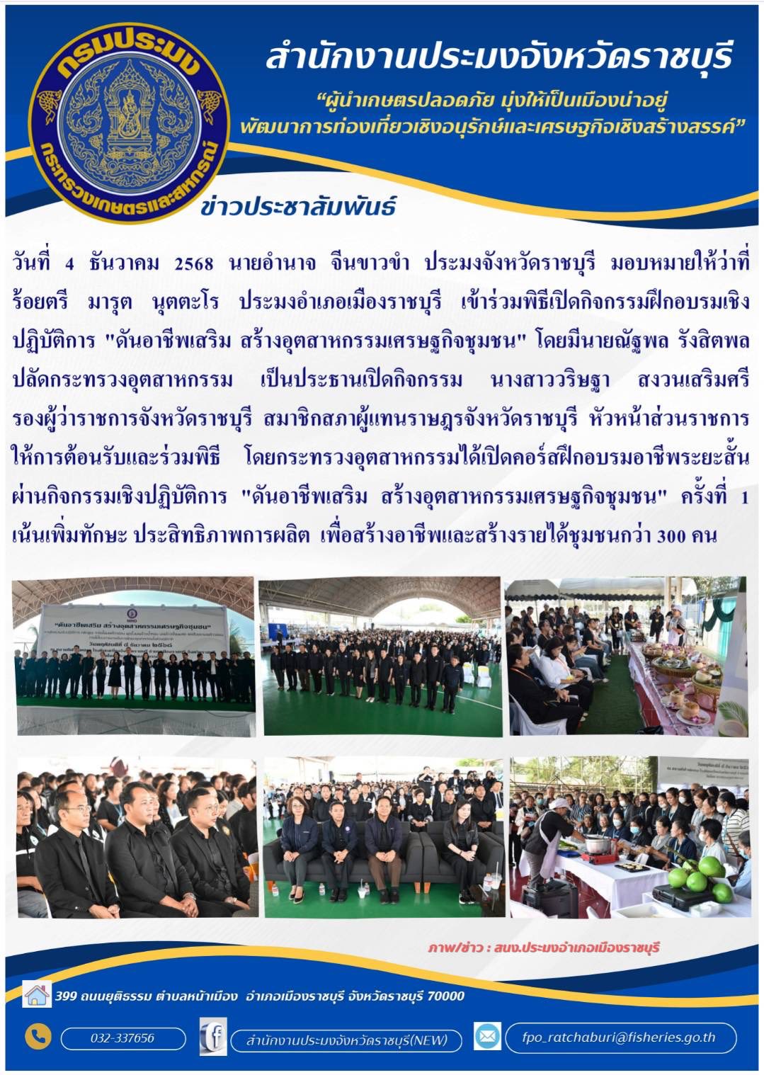 วันที่ 4 ธันวาคม 2568 นายอำนาจ จีนขาวขำ ประมงจังหวัดราชบุรี มอบหมายให้ว่าที่ร้อยตรี มารุต นุตตะโร ประมงอำเภอเมืองราชบุรี เข้าร่วมพิธีเปิดกิจกรรมฝึกอบรมเชิงปฏิบัติการ "ดันอาชีพเสริม สร้างอุตสาหกรรมเศรษฐกิจชุมชน" โดยมีนายณัฐพล รังสิตพล ปลัดกระทรวงอุตสาหกรรม เป็นประธานเปิดกิจกรรม นางสาววริษฐา สงวนเสริมศรี รองผู้ว่าราชการจังหวัดราชบุรี สมาชิกสภาผู้แทนราษฎรจังหวัดราชบุรี หัวหน้าส่วนราชการ ให้การต้อนรับและร่วมพิธี โดยกระทรวงอุตสาหกรรมได้เปิดคอร์สฝึกอบรมอาชีพระยะสั้น ผ่านกิจกรรมเชิงปฏิบัติการ "ดันอาชีพเสริม สร้างอุตสาหกรรมเศรษฐกิจชุมชน" ครั้งที่ 1 เน้นเพิ่มทักษะ ประสิทธิภาพการผลิต เพื่อสร้างอาชีพและสร้างรายได้ชุมชนกว่า 300 คน