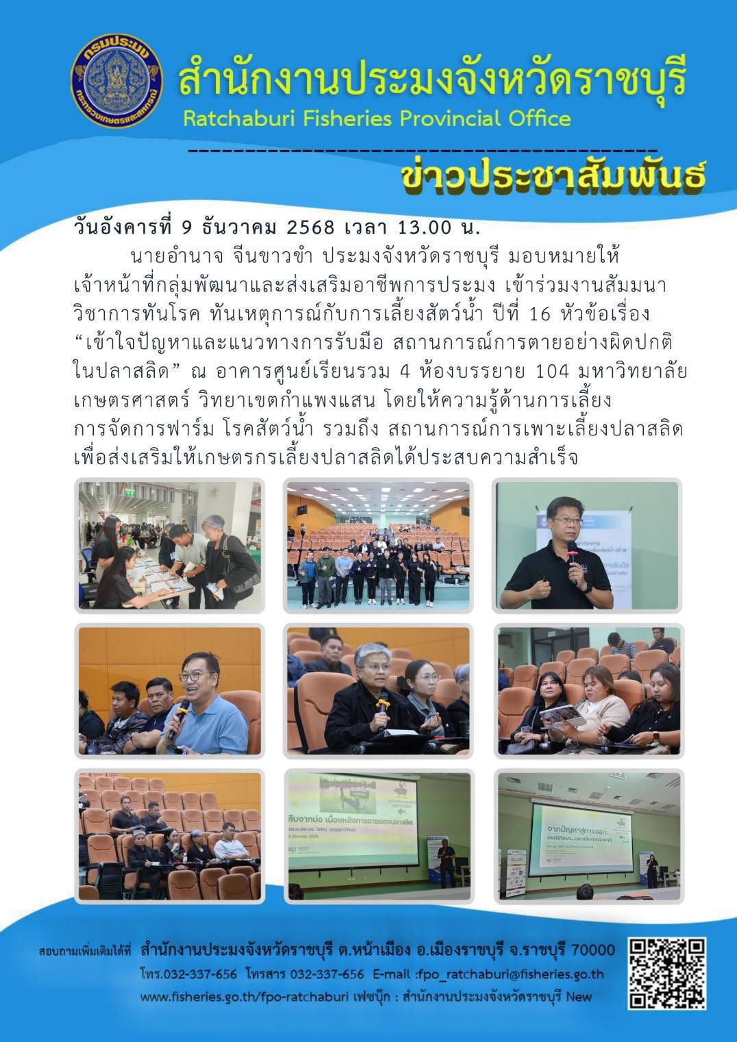 วันอังคารที่ 9 ธันวาคม 2568 เวลา 13.00 น. นายอำนาจ จีนขาวขำ ประมงจังหวัดราชบุรี มอบหมายให้เจ้าหน้าที่กลุ่มพัฒนาและส่งเสริมอาชีพการประมง เข้าร่วมงานสัมมนาวิชาการทันโรค ทันเหตุการณ์กับการเลี้ยงสัตว์น้ำ ปีที่ 16 หัวข้อเรื่อง “เข้าใจปัญหาและแนวทางการรับมือ สถานการณ์การตายอย่างผิดปกติในปลาสลิด” ณ อาคารศูนย์เรียนรวม 4 ห้องบรรยาย 104 มหาวิทยาลัยเกษตรศาสตร์ วิทยาเขตกำแพงแสน โดยให้ความรู้ด้านการเลี้ยง การจัดการฟาร์ม โรคสัตว์น้ำ รวมถึง สถานการณ์การเพาะเลี้ยงปลาสลิด เพื่อส่งเสริมให้เกษตรกรเลี้ยงปลาสลิดได้ประสบความสำเร็จ