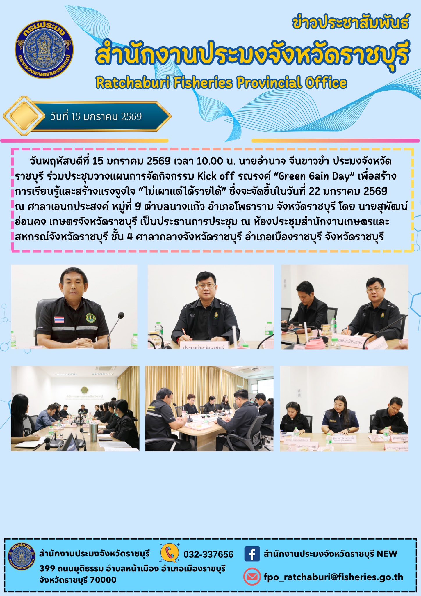 วันพฤหัสบดีที่ 15 มกราคม 2569 เวลา 10.00 น. นายอำนาจ จีนขาวขำ ประมงจังหวัดราชบุรี ร่วมประชุมวางแผนการจัดกิจกรรม Kick off รณรงค์ “Green Gain Day” เพื่อสร้างการเรียนรู้และสร้างแรงจูงใจ “ไม่เผาแต่ได้รายได้” ซึ่งจะจัดขึ้นในวันที่ 22 มกราคม 2569 ณ ศาลาเอนกประสงค์ หมู่ที่ 9 ตำบลนางแก้ว อำเภอโพธาราม จังหวัดราชบุรี โดย นายสุพัฒน์ อ่อนคง เกษตรจังหวัดราชบุรี เป็นประธานการประชุม ณ ห้องประชุมสำนักงานเกษตรและสหกรณ์จังหวัดราชบุรี ชั้น 4 ศาลากลางจังหวัดราชบุรี อำเภอเมืองราชบุรี จังหวัดราชบุรี