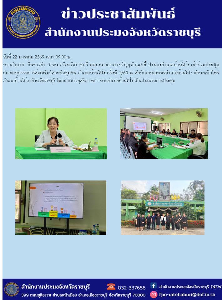 วันที่ 22 มกราคม 2569 เวลา 09.00 น. นายอำนาจ จีนขาวขำ ประมงจังหวัดราชบุรี มอบหมาย นางขวัญฤทัย แซ่ลี้ ประมงอำเภอบ้านโป่ง เข้าร่วมประชุมคณะอนุกรรมการส่งเสริมวิสาหกิจชุมชน อำเภอบ้านโป่ง ครั้งที่ 1/2569 ณ สำนักงานเกษตรอำเภอบ้านโป่ง ตำบลเบิกไพร อำเภอบ้านโป่ง จังหวัดราชบุรี โดยนางสาวกุลธิดา พยา นายอำเภอบ้านโป่ง เป็นประธานการประชุม