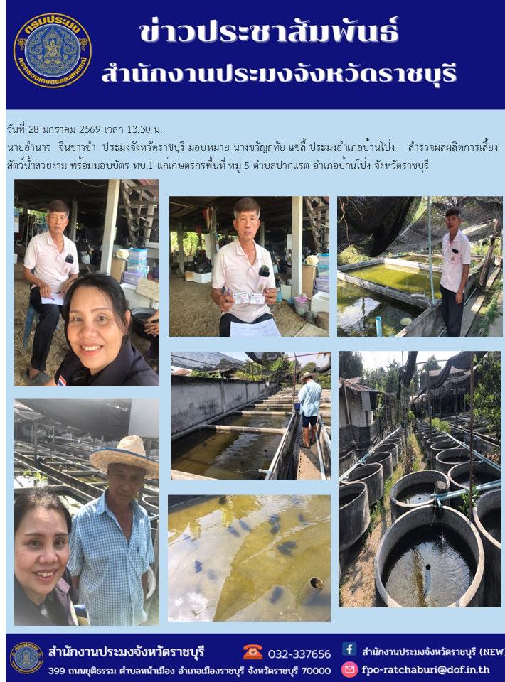 วันที่ 28 มกราคม 2569 เวลา 13.30 น. นายอำนาจ จีนขาวขำ ประมงจังหวัดราชบุรี มอบหมาย นางขวัญฤทัย แซ่ลี้ ประมงอำเภอบ้านโป่ง สำรวจผลผลิตการเลี้ยงสัตว์น้ำสวยงาม พร้อมมอบบัตร ทบ.1 แก่เกษตรกรพื้นที่ หมู่ 5 ตำบลปากแรต อำเภอบ้านโป่ง จังหวัดราชบุรี