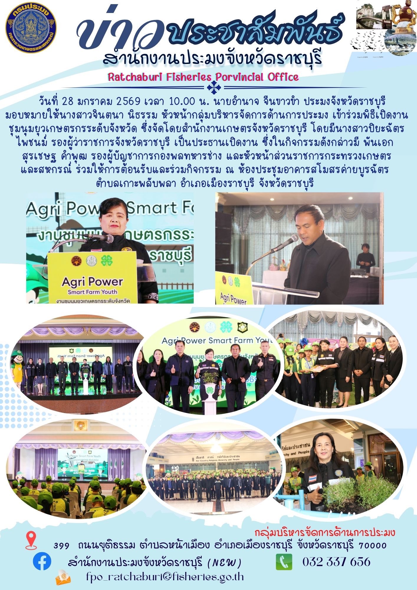 วันที่ 28 มกราคม 2569 เวลา 10.00 น. นายอำนาจ จีนขาวขำ ประมงจังหวัดราชบุรี มอบหมายให้นางสาวจินตนา นิธรรม หัวหน้ากลุ่มบริหารจัดการด้านการประมง เข้าร่วมพิธีเปิดงานชุมนุมยุวเกษตรกรระดับจังหวัด ซึ่งจัดโดยสำนักงานเกษตรจังหวัดราชบุรี โดยมีนางสาวปิยะฉัตร ไพชนม์ รองผู้ว่าราชการจังหวัดราชบุรี เป็นประธานเปิดงาน ซึ่งในกิจกรรมดังกล่าวมี พันเอก สุรเชษฐ คำพุฒ รองผู้บัญชาการกองพลทหารช่าง และหัวหน้าส่วนราชการกระทรวงเกษตรและสหกรณ์ ร่วมให้การต้อนรับและร่วมกิจกรรม ณ ห้องประชุมอาคารสโมสรค่ายบูรฉัตร ตำบลเกาะพลับพลา อำเภอเมืองราชบุรี จังหวัดราชบุรี