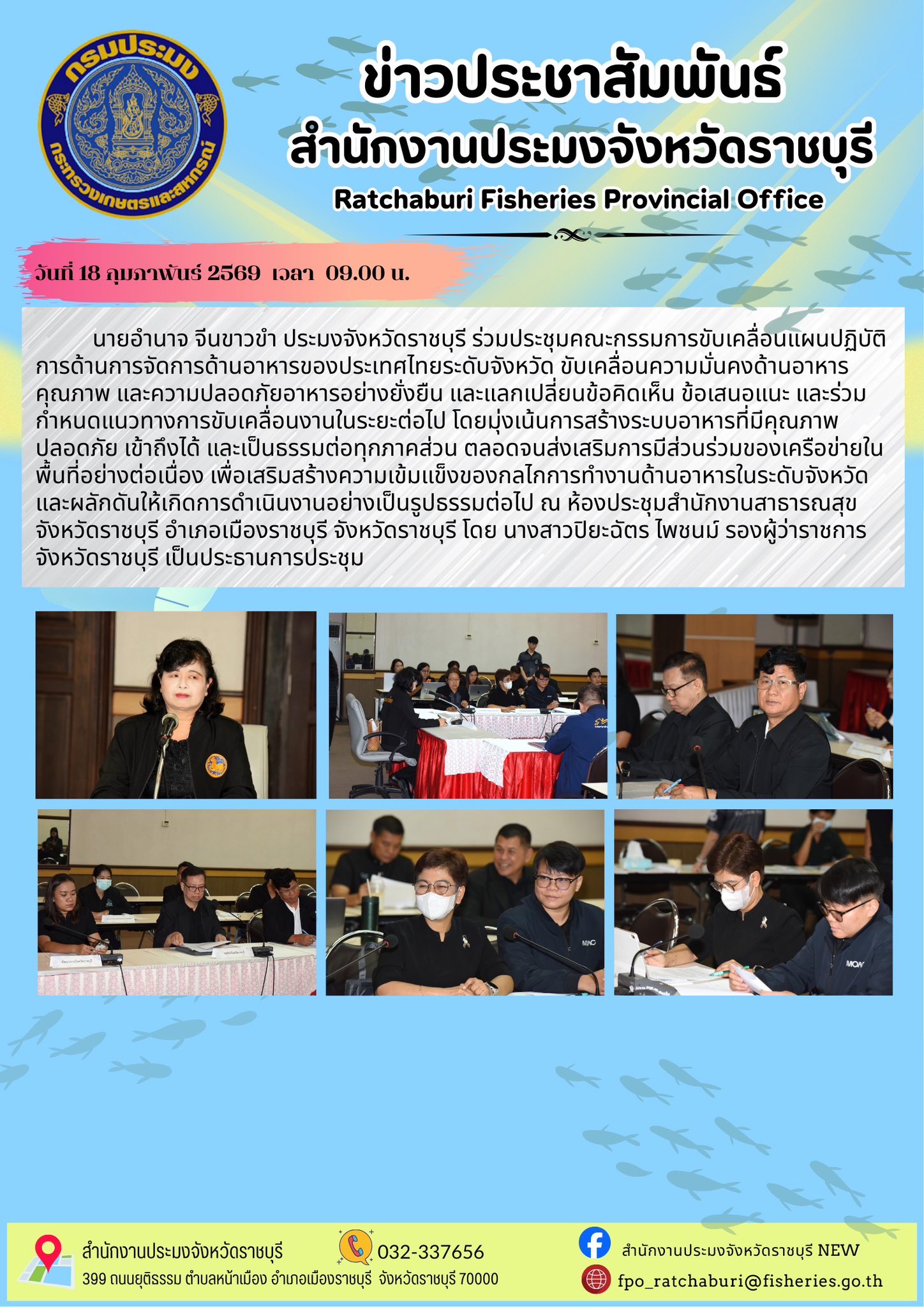 วันที่ 18 กุมภาพันธ์ 2569 เวลา 09.00 น. นายอำนาจ จีนขาวขำ ประมงจังหวัดราชบุรี ร่วมประชุมคณะกรรมการขับเคลื่อนแผนปฏิบัติการด้านการจัดการด้านอาหารของประเทศไทยระดับจังหวัด ขับเคลื่อนความมั่นคงด้านอาหาร คุณภาพ และความปลอดภัยอาหารอย่างยั่งยืน และแลกเปลี่ยนข้อคิดเห็น ข้อเสนอแนะ และร่วมกำหนดแนวทางการขับเคลื่อนงานในระยะต่อไป โดยมุ่งเน้นการสร้างระบบอาหารที่มีคุณภาพ ปลอดภัย เข้าถึงได้ และเป็นธรรมต่อทุกภาคส่วน ตลอดจนส่งเสริมการมีส่วนร่วมของเครือข่ายในพื้นที่อย่างต่อเนื่อง เพื่อเสริมสร้างความเข้มแข็งของกลไกการทำงานด้านอาหารในระดับจังหวัด และผลักดันให้เกิดการดำเนินงานอย่างเป็นรูปธรรมต่อไป ณ ห้องประชุมสำนักงานสาธารณสุขจังหวัดราชบุรี อำเภอเมืองราชบุรี จังหวัดราชบุรี โดย นางสาวปิยะฉัตร ไพชนม์ รองผู้ว่าราชการจังหวัดราชบุรี เป็นประธานการประชุม