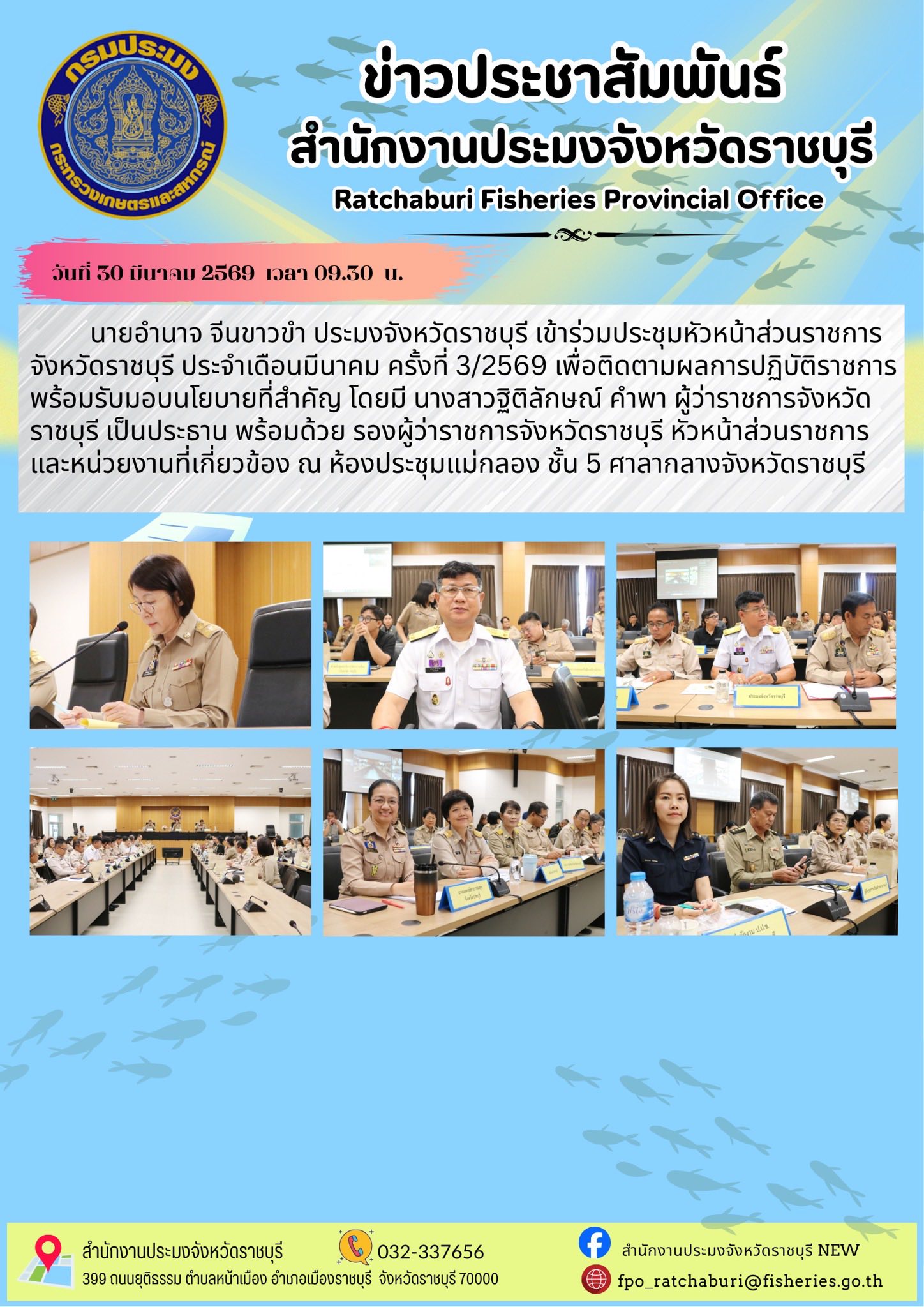 วันที่ 30 มีนาคม 2569 เวลา 09.30 น. นายอำนาจ จีนขาวขำ ประมงจังหวัดราชบุรี เข้าร่วมประชุมหัวหน้าส่วนราชการจังหวัดราชบุรี ประจำเดือนมีนาคม ครั้งที่ 3/2569 เพื่อติดตามผลการปฏิบัติราชการ พร้อมรับมอบนโยบายที่สำคัญ โดยมี นางสาวฐิติลักษณ์ คำพา ผู้ว่าราชการจังหวัดราชบุรี เป็นประธาน พร้อมด้วย รองผู้ว่าราชการจังหวัดราชบุรี หัวหน้าส่วนราชการ และหน่วยงานที่เกี่ยวข้อง ณ ห้องประชุมแม่กลอง ชั้น 5 ศาลากลางจังหวัดราชบุรี