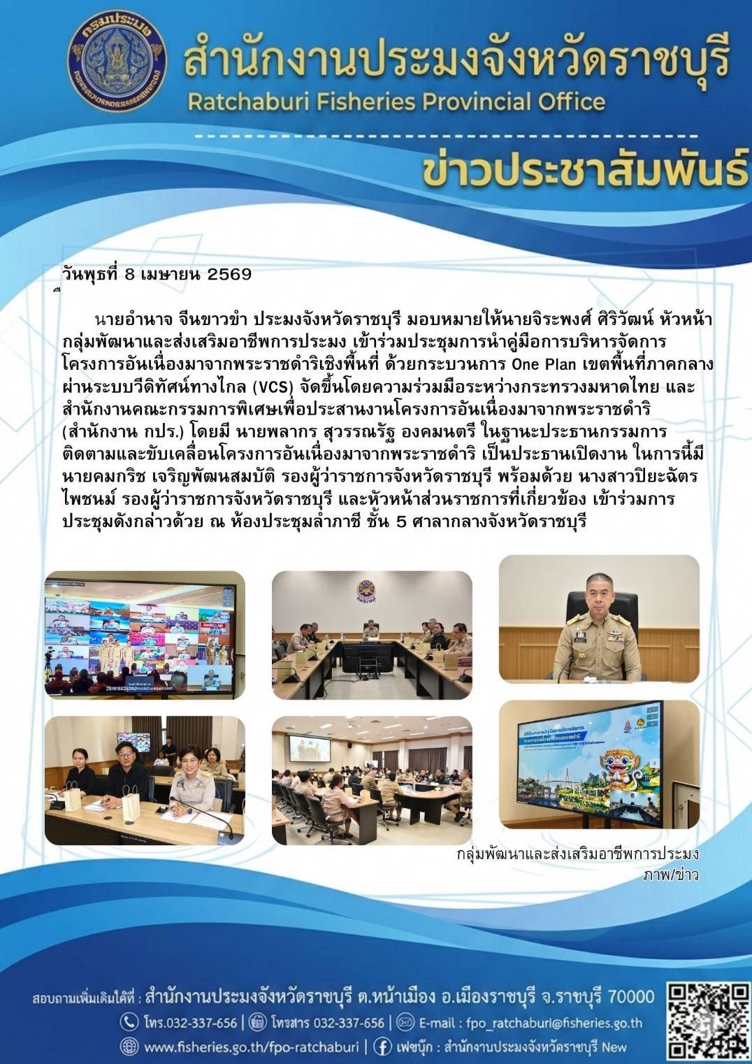 วันพุธที่ 8 เมษายน 2569 นายอำนาจ จีนขาวขำ ประมงจังหวัดราชบุรี มอบหมายให้นายจิระพงศ์ ศิริวัฒน์ หัวหน้ากลุ่มพัฒนาและส่งเสริมอาชีพการประมง เข้าร่วมประชุมการนำคู่มือการบริหารจัดการโครงการอันเนื่องมาจากพระราชดำริเชิงพื้นที่ ด้วยกระบวนการ One Plan เขตพื้นที่ภาคกลาง ผ่านระบบวีดิทัศน์ทางไกล (VCS) จัดขึ้นโดยความร่วมมือระหว่างกระทรวงมหาดไทย และสำนักงานคณะกรรมการพิเศษเพื่อประสานงานโครงการอันเนื่องมาจากพระราชดำริ (สำนักงาน กปร.) โดยมี นายพลากร สุวรรณรัฐ องคมนตรี ในฐานะประธานกรรมการติดตามและขับเคลื่อนโครงการอันเนื่องมาจากพระราชดำริ เป็นประธานเปิดงาน ในการนี้มีนายคมกริช เจริญพัฒนสมบัติ รองผู้ว่าราชการจังหวัดราชบุรี พร้อมด้วย นางสาวปิยะฉัตร ไพชนม์ รองผู้ว่าราชการจังหวัดราชบุรี และหัวหน้าส่วนราชการที่เกี่ยวข้อง เข้าร่วมการประชุมดังกล่าวด้วย ณ ห้องประชุมลำภาชี ชั้น 5 ศาลากลางจังหวัดราชบุรี